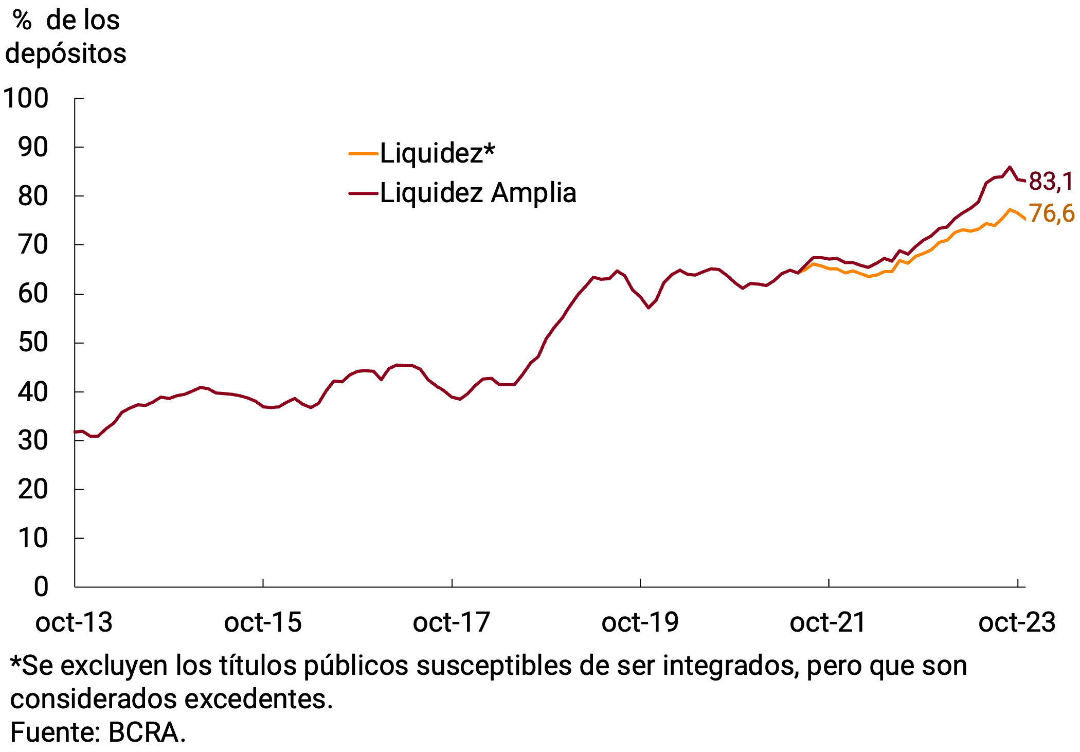 En noviembre, la liquidez bancaria amplia en moneda local6 se redujo 0,3 p.p. con respecto del mes previo, promediando 83,1% de los depósitos, permaneciendo en niveles históricamente elevados (ver Gráficos 6.1 y 6.2). Dicha caída se explicó fundamentalmente por la tenencia de pasivos remunerados del BCRA por parte de las entidades, contrarrestado parcialmente por la suba en las cuentas corrientes en el Banco Central. Esta última se encuentra asociada tanto a un incremento en la exigencia de efectivo mínimo producto del crecimiento de los depósitos a la vista en el mes de octubre, como a la posición excedente que mantuvieron las entidades financieras.