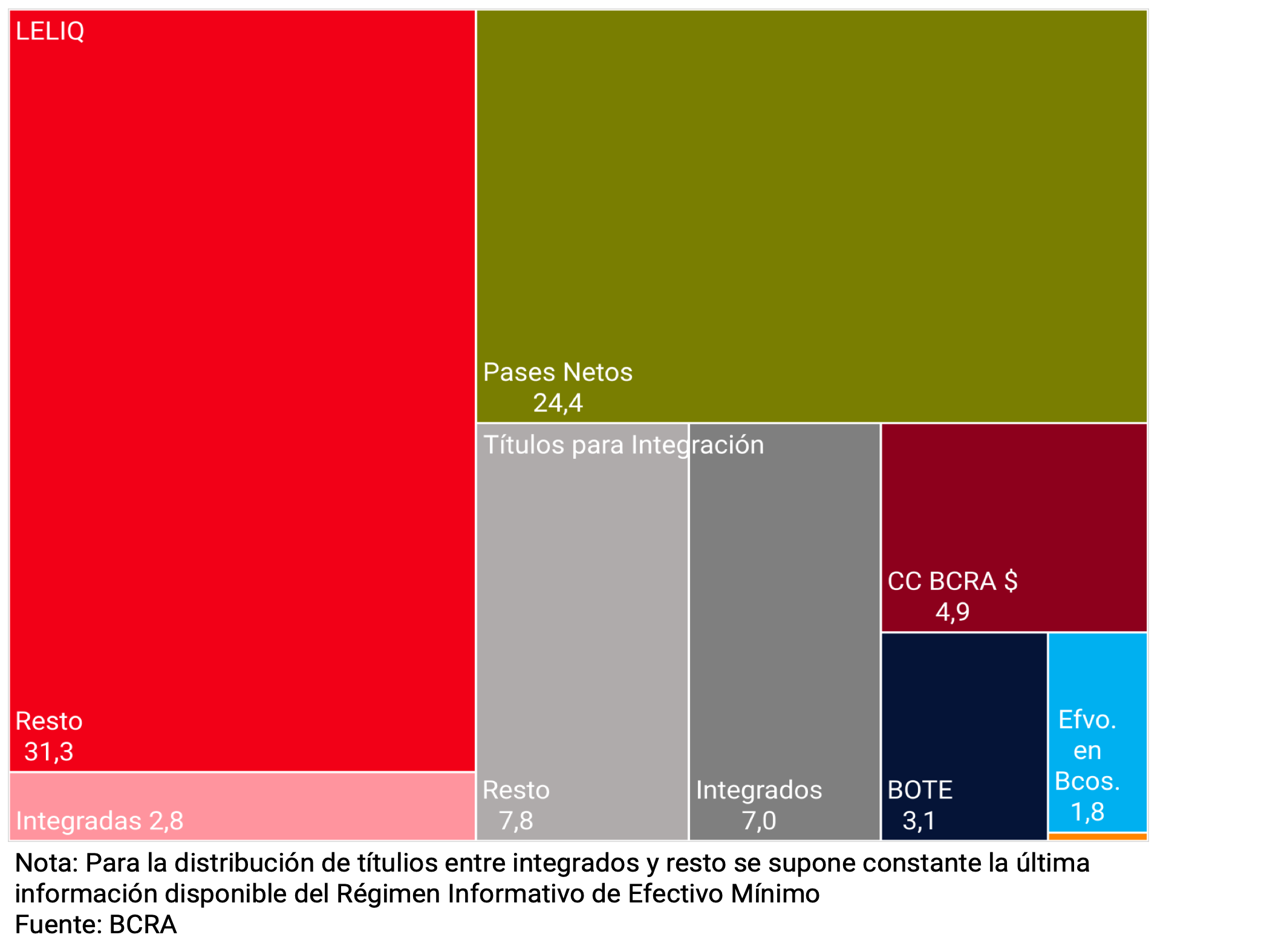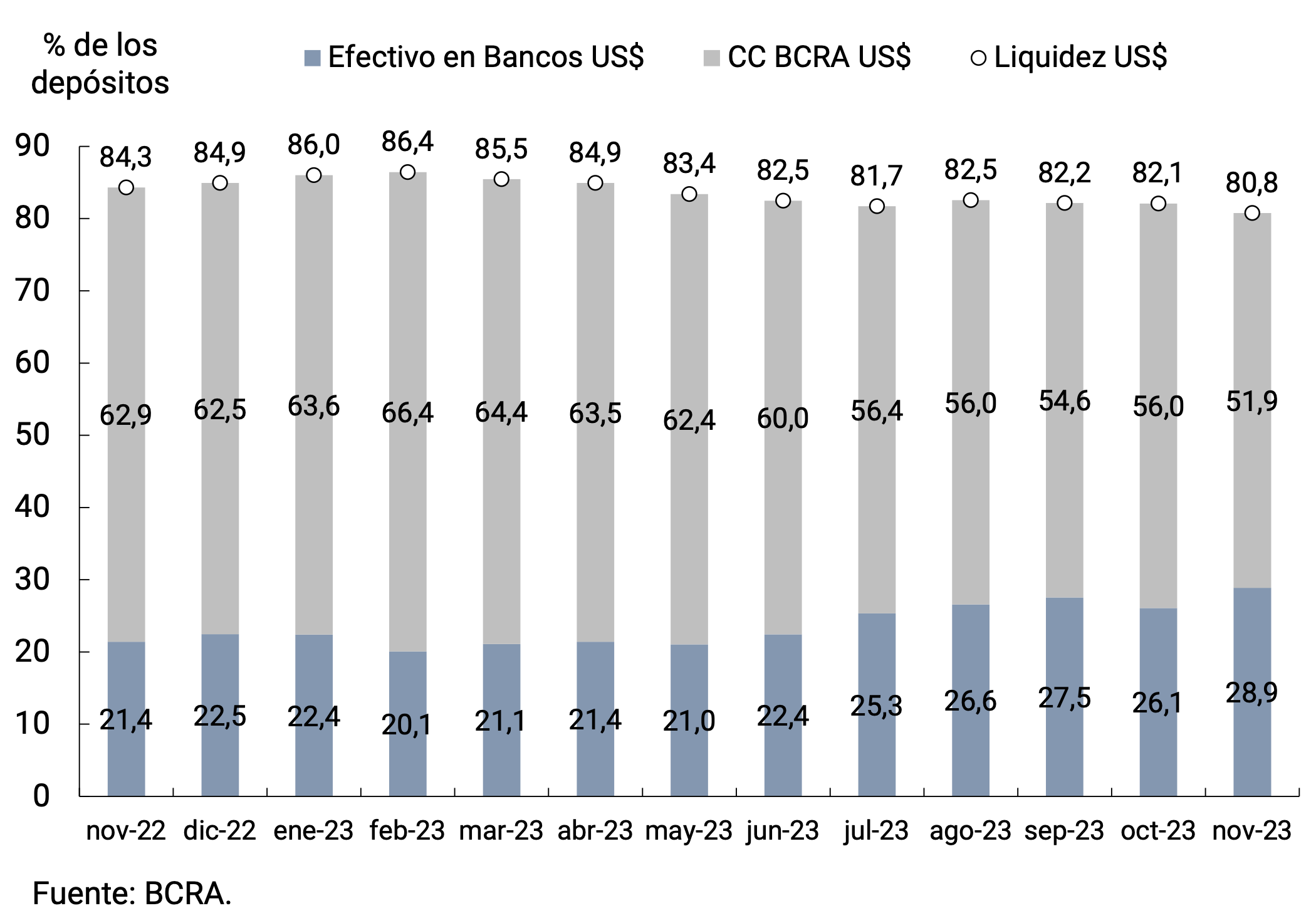 6 Incluye las cuentas corrientes en el BCRA, el efectivo en bancos, los saldos de pases netos concertados con el BCRA, las tenencias de LELIQ y NOTALIQ y los bonos públicos elegibles para integrar encajes.