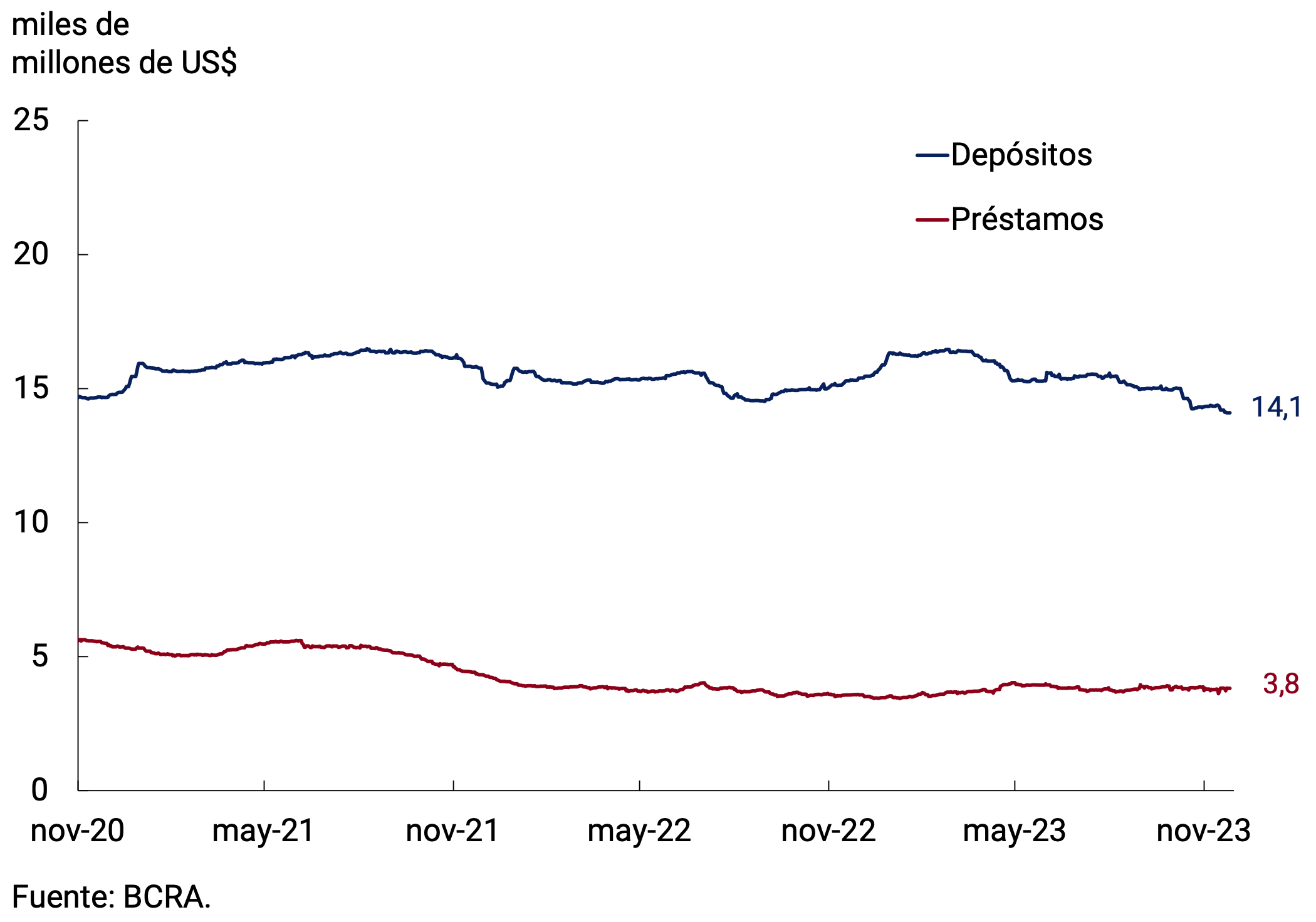 En el segmento en moneda extranjera, los principales activos y pasivos de las entidades financieras presentaron variaciones negativas. Por un lado, los depósitos del sector privado presentaron una caída de US$181 millones en el mes y finalizaron octubre con un saldo de US$14.136 millones. Esta caída se concentró en los depósitos de personas humanas. Por otro lado, el saldo de los préstamos al sector privado registro una caída de U$S96 millones y finalizó el mes en US$3.773 millones (ver Gráfico 7.1).