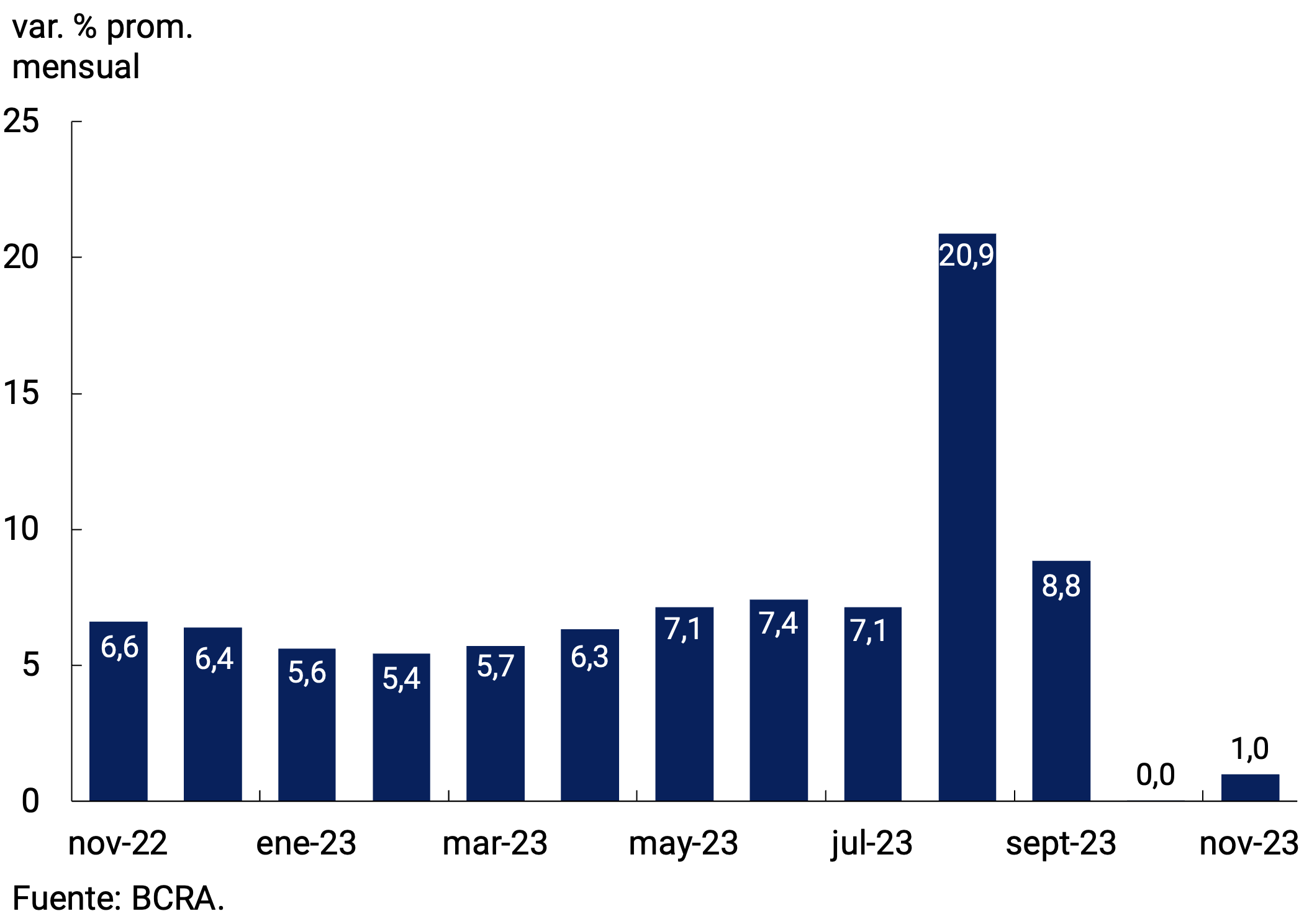 El 19 de noviembre se llevó a cabo la segunda vuelta de las elecciones presidenciales, lo que le continuó aportando volatilidad a los mercados. El BCRA decidió mantener sin cambios las tasas de interés de los instrumentos de regulación monetaria y las tasas de interés mínimas de los depósitos a plazo fijo, luego de haberlas incrementado en 15 p.p. en octubre.