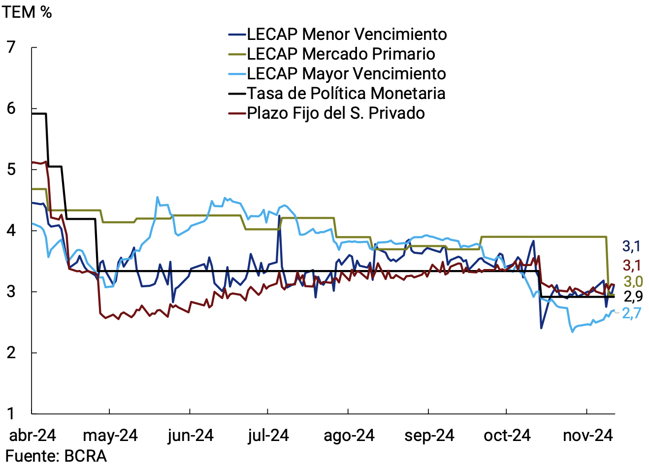 Cabe destacar que a comienzos del mes el BCRA bajó la tasa de interés de estos instrumentos en 5 p.p., pasando a situarse en 35% n.a. También redujo la tasa de interés de pases activos de 45% a 40% n.a. A su vez, en diciembre dispuso una reducción de la tasa de política monetaria de 3 p.p., que desde el 6 de ese mes pasa a ubicarse en 32%. Por su parte, la tasa de interés de pases activos pasará de 40% a 36%. Las bajas de tasas responden a las condiciones de liquidez, el descenso observado en la tasa de inflación y en las expectativas de inflación manifestadas tanto en el REM como en los niveles implícitos en el mercado secundario de títulos, junto al afianzamiento del ancla fiscal.