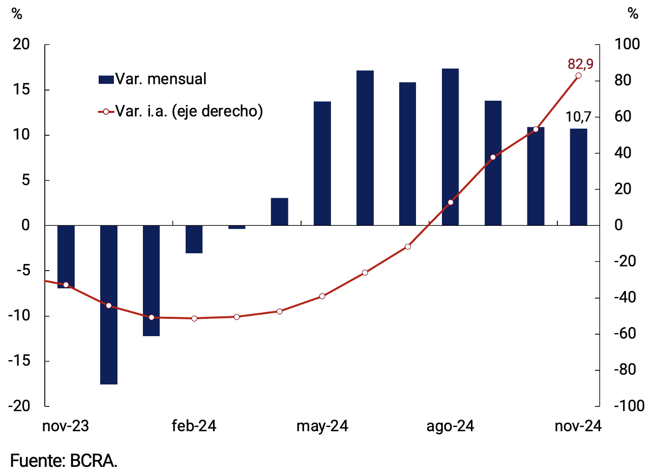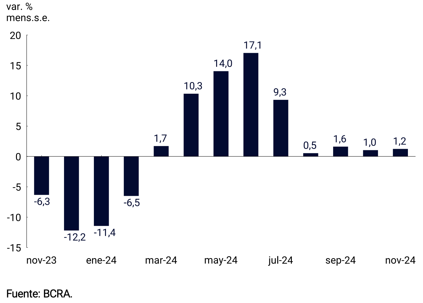 Los préstamos con garantía real (hipotecarios y prendarios) volvieron a ser los más dinámicos, con un incremento real de 11,5% s.e. mensual. El crédito hipotecario creció 19,7% s.e. a precios constantes, aunque todavía se encuentran 6,8% por debajo del nivel de noviembre de 2023. El impulso a los créditos hipotecarios vino nuevamente de las líneas ajustables por Unidad de Valor Adquisitivo (UVA; ver Gráfico 3.2.3). Por su parte, los préstamos prendarios aumentaron 7,8% real s.e. y resultan 21,8% superiores al registro de un año atrás.