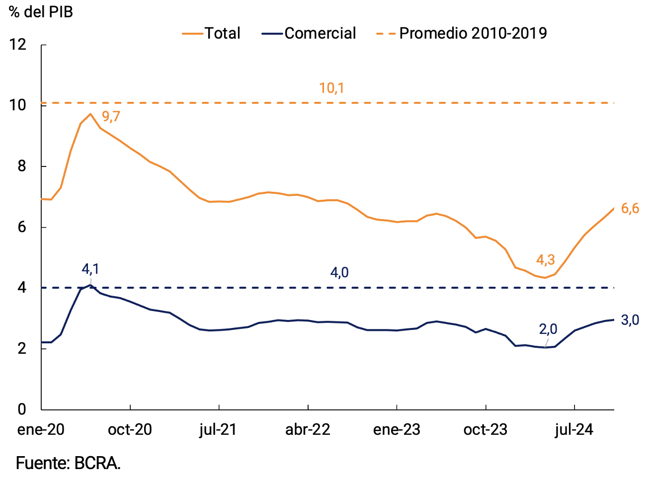 El agregado monetario amplio, M3 privado1 registró un aumento de 4,0% mensual a precios constantes y ajustado por estacionalidad, ritmo de crecimiento superior al de los meses previos. De este modo, se afianza el proceso de recuperación de la demanda de dinero desde mínimos históricos, en un contexto de descenso continuo en la tasa de inflación y de recuperación de los ingresos. Como porcentaje del PIB se habría ubicado en 12,3%, 0,3 p.p. por encima del mes previo, aunque todavía 2,1 p.p. debajo en la comparación interanual.