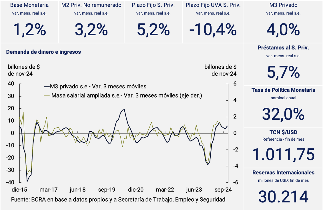 En sintonía con la recuperación de los ingresos de las familias, continuó el proceso de recomposición de la demanda de dinero. El M3 privado registró un aumento de 4,0% en términos reales y sin estacionalidad, que resultó superior al de los meses previos. En cuanto a sus componentes, la expansión se explicó nuevamente por el comportamiento de los depósitos a plazo fijo y también, aunque en menor medida, de los medios de pago.