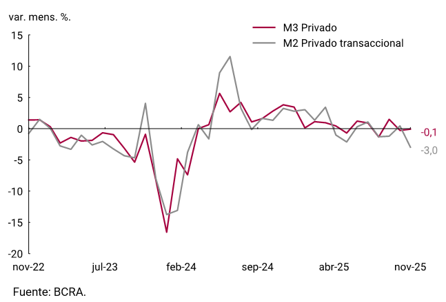 En noviembre, el agregado monetario amplio (M3 privado)1 registró un aumento promedio mensual de $1,5 billones, lo que implicó una ligera contracción en términos reales y sin estacionalidad (-0,1%). Como porcentaje del PIB el M3 privado se ubicó en 13,3%, en torno al registro de los primeros diez meses del año y marcadamente por debajo del promedio histórico (17,6% en el período 2004-2025).
