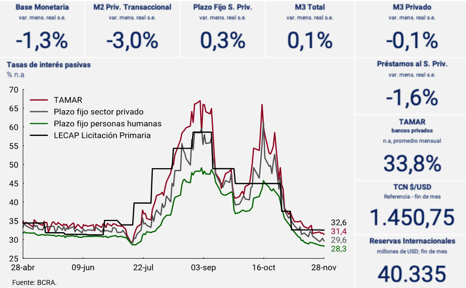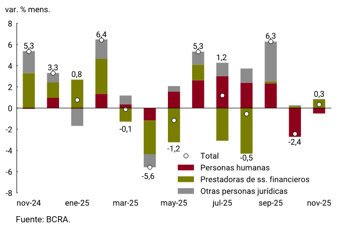 En tanto, los depósitos a plazo fijo presentaron un leve aumento a precios constantes (0,3% s.e.), incluso en un contexto de baja de las tasas de interés pagadas por estas colocaciones, tras disiparse la incertidumbre electoral. Por su parte, la vista remunerada, cuyos principales tenedores son las “Prestadoras de Servicios Financieros”, crecieron en el mes 0,4% s.e. real, concentrándose el aumento en los últimos días de noviembre, tendencia que continuó a principios de diciembre. Sobre esta dinámica incidió una resolución de la CNV, a través de la cual se fijó un límite máximo de 20% del patrimonio de los FCI de Money Market para invertir en cauciones.