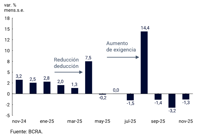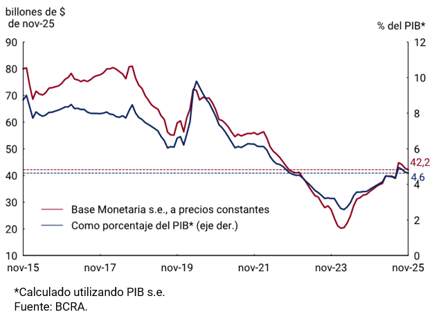 En cuanto a la creación primaria, la Base Monetaria cayó 1,3% real s.e. en noviembre, situándose en 4,6% del PIB. De cara al último mes del año, en el que presenta una marcada estacionalidad positiva, el BCRA avanzó en la normalización de los requerimientos de encaje, disminuyendo la exigencia integrable en pesos a partir de diciembre. Complementariamente, dispuso que la integración mínima diaria sea del 75% de la exigencia de efectivo mínimo total en pesos del período.