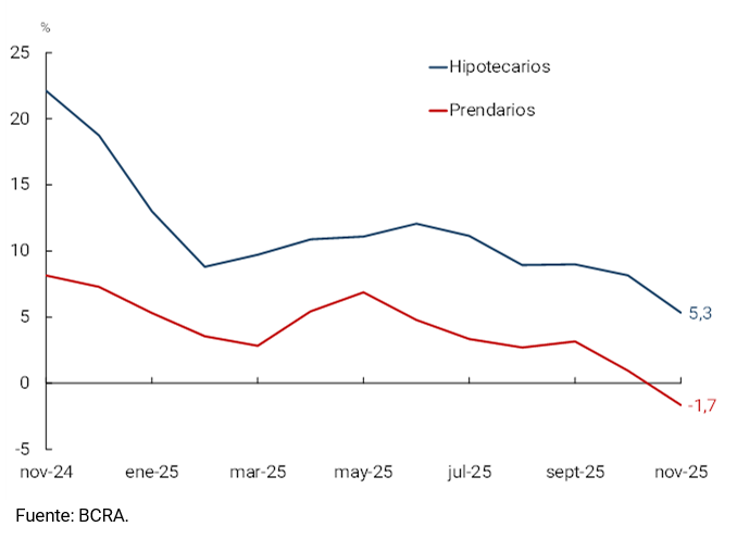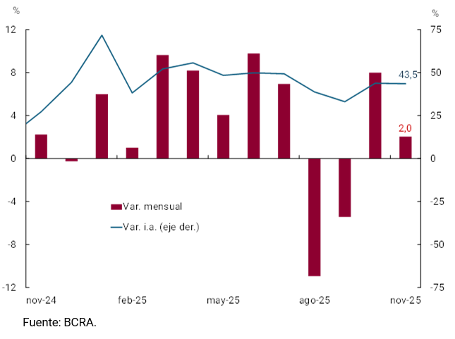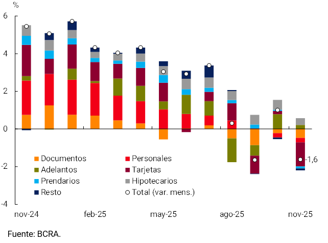 Por último, los préstamos al consumo exhibieron una contracción en el mes de 3,2% s.e. en términos reales, la mayor desde principios de 2024. La caída fue explicada en gran medida por las financiaciones con tarjetas de crédito, que se redujeron 5,0% s.e. en términos reales frente a octubre. Sin embargo, en los últimos 12 meses acumulan un aumento de 19,9% real. Por último, los préstamos personales registraron una caída a precios constantes de 1,1% s.e. y acumularon un aumento interanual de 61,7% medido a precios constantes.