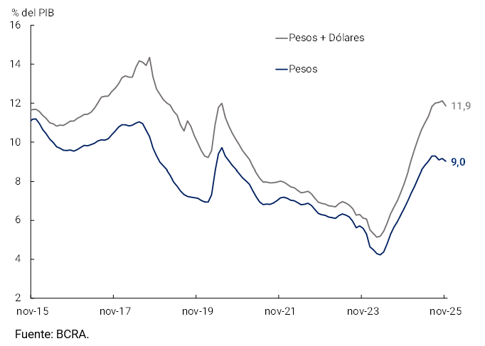 En noviembre, los préstamos en pesos al sector privado registraron una caída de 1,6% en términos reales y ajustado por estacionalidad. La mayoría de las líneas de crédito mostraron una disminución en el mes, con excepción de los adelantos y los créditos hipotecarios (ver Gráfico 3.2.1). Esta variación es consistente con una expansión secundaria de $1,6 billones. En términos interanuales, los préstamos crecieron 34,8% a precios constantes y en términos del PIB se ubicaron en 9%, duplicando el registro de inicios de 2024. Incluyendo también los préstamos en dólares, el ratio de crédito a PIB ascendió a 11,9% (ver Gráfico 3.2.2).