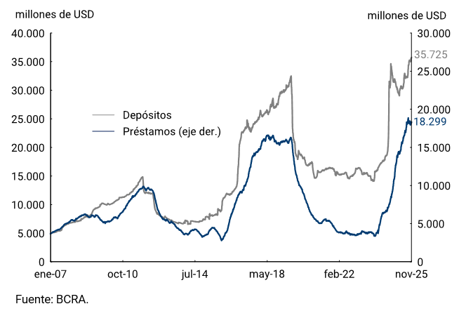 Los principales activos y pasivos en moneda extranjera de las entidades financieras presentaron comportamientos disímiles en noviembre. Por un lado, los depósitos del sector privado aumentaron en USD615 millones en noviembre, distribuidos en partes similares entre depósitos en cajas de ahorro y colocaciones a plazo fijo. Así, el saldo a fin de mes se ubicó en USD35.725 millones, alcanzando un nuevo máximo histórico (ver Gráfico 4.1). Cabe destacar que al cierre de noviembre tuvo lugar el vencimiento del BOPREAL (serie 3) por un monto total entre capital e intereses de USD1.012,5 millones. Dado que el mes finalizó un domingo, el pago se efectuó el primer día hábil siguiente, lo que implicó un aumento de los depósitos en dólares el 1 de diciembre. Por otro lado, los préstamos al sector privado registraron una caída en el mes de USD150 millones, para finalizar el mes con un saldo de USD18.299 millones. Parte de esta caída se explica por la cancelación de préstamos con el producido de la colocación de Obligaciones Negociables por parte de empresas en el mercado internacional.