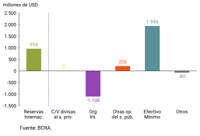 Entre saldos a fin de mes, la Base Monetaria se contrajo $0,4 billones dadas las operaciones del BCRA en el mercado secundario (operaciones de mercado abierto) y su participación en la rueda de operaciones simultáneas. Respecto de las operaciones del fisco, que resultaron prácticamente neutras, cabe mencionar que se efectuaron ventas de divisas al Tesoro Nacional en tres oportunidades a lo largo del mes. Las mismas fueron realizadas con fondos de su cuenta en pesos en el BCRA, por lo que su efecto monetario fue nulo.