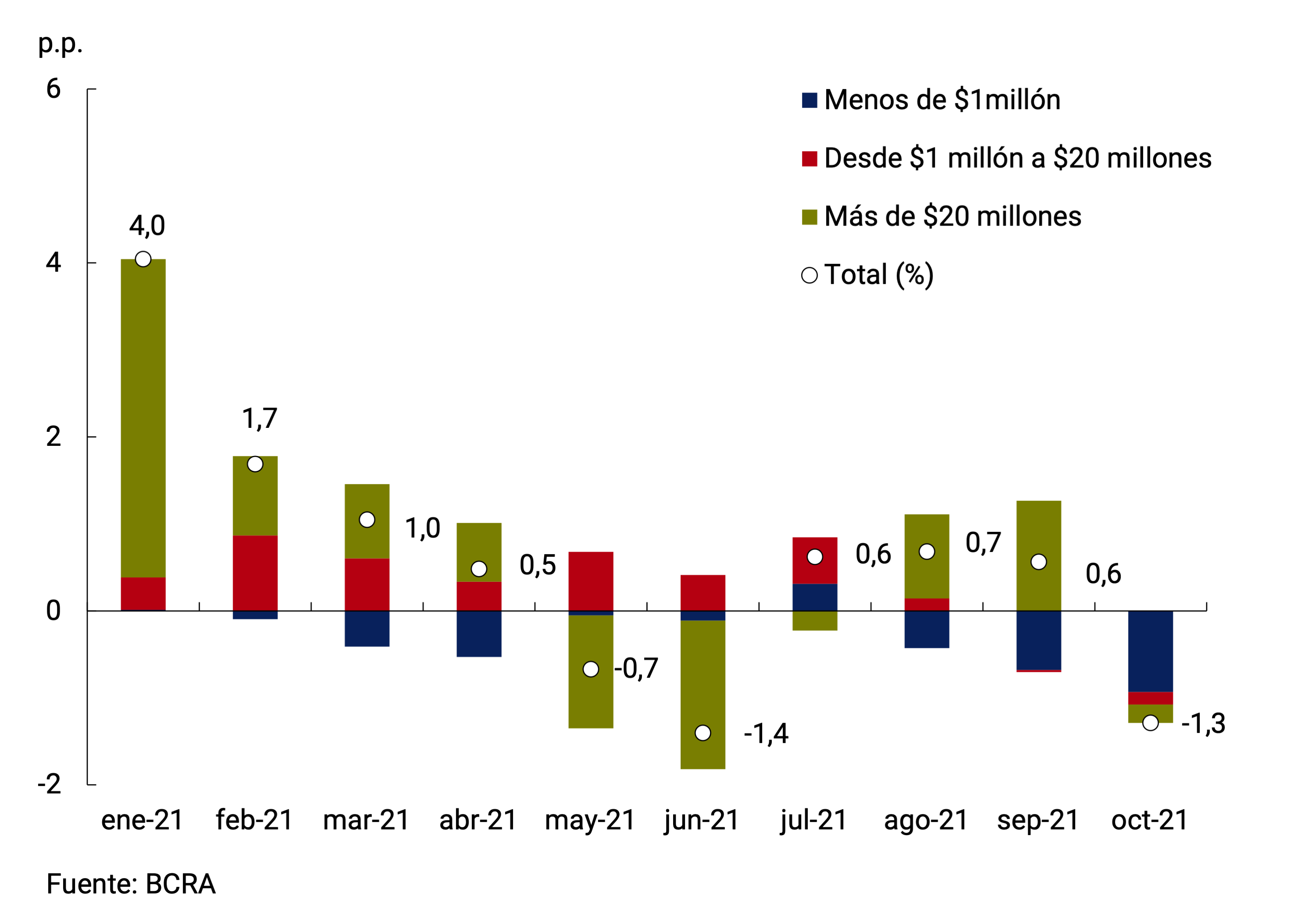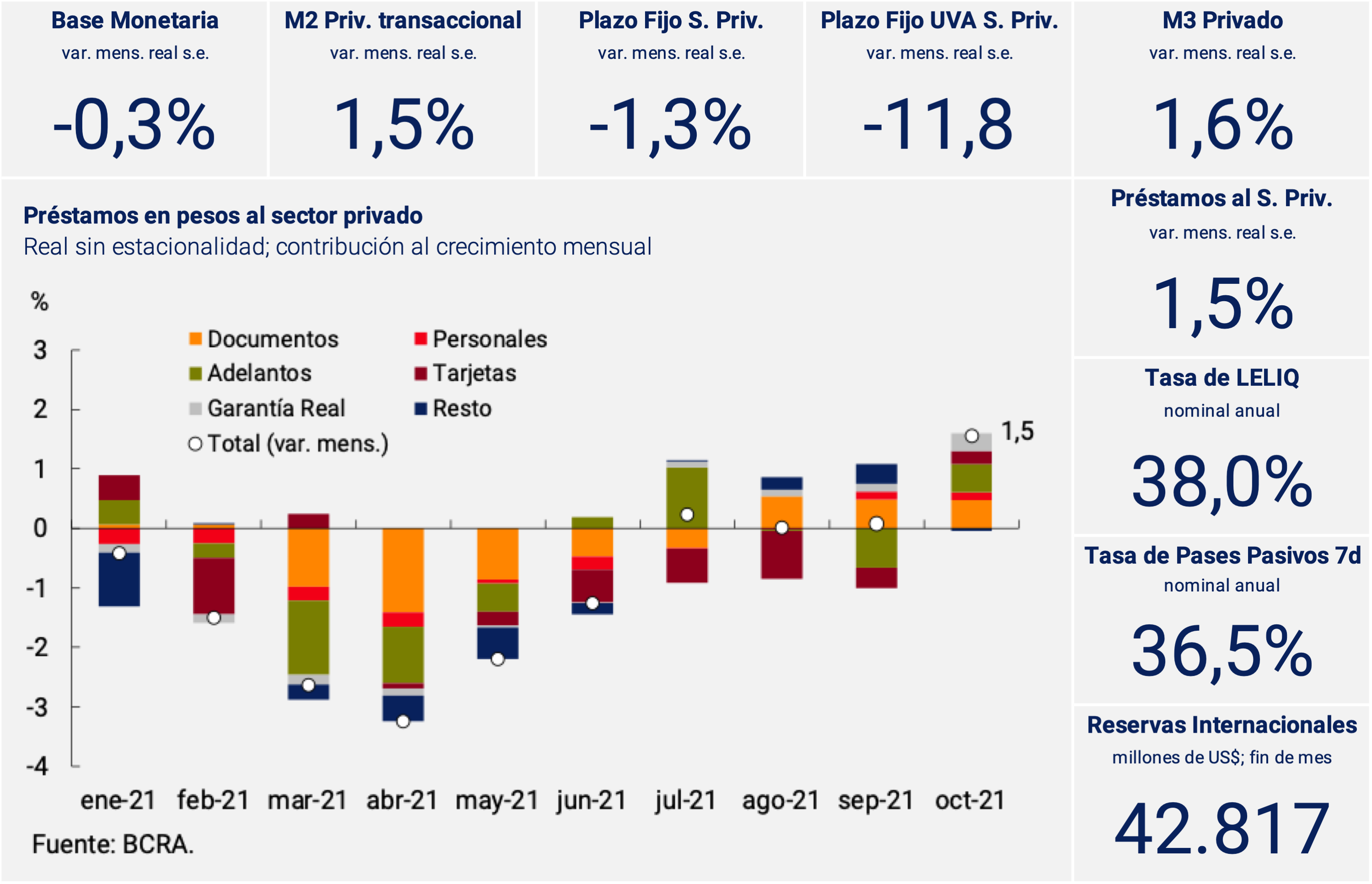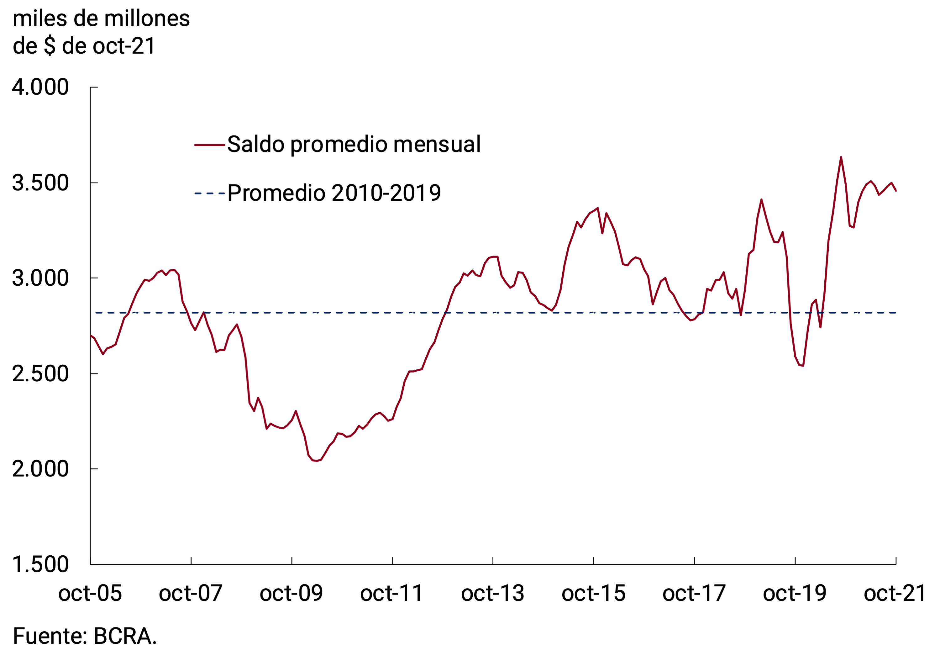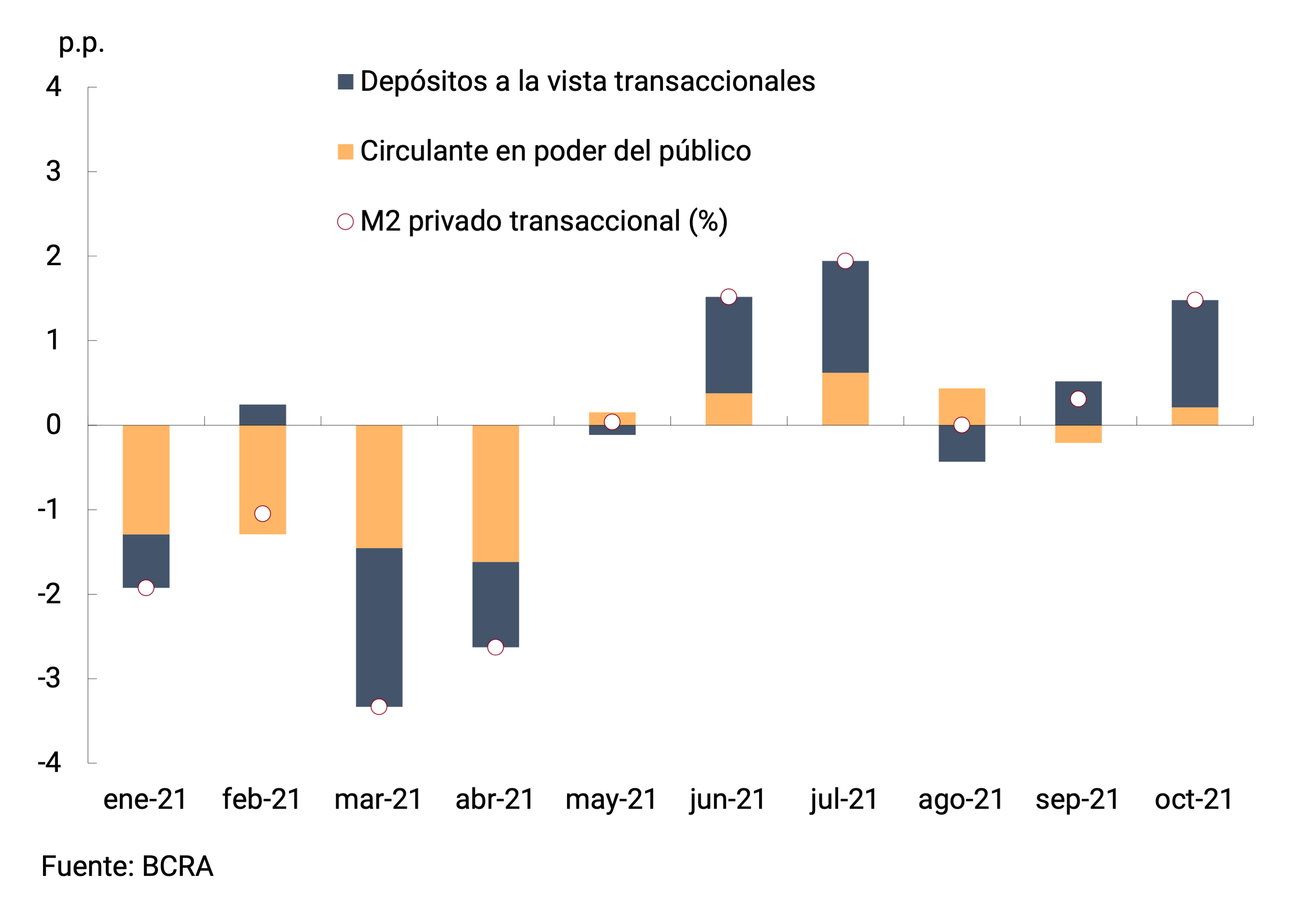 Entre los factores que impactaron en la evolución de los medios de pago transaccionales en octubre se destaca el ingreso de tramos de ajustes salariales acordados en paritarias por varios gremios. Esto se reflejó en el crecimiento de los depósitos a la vista transaccionales durante los primeros días del mes. Otro factor que alentó, de manera transitoria, la demanda de dinero transaccional fue el mayor movimiento turístico en virtud del fin de semana largo.