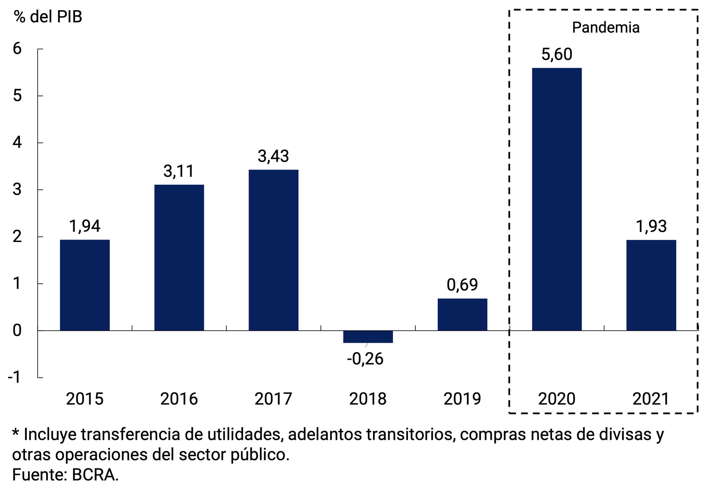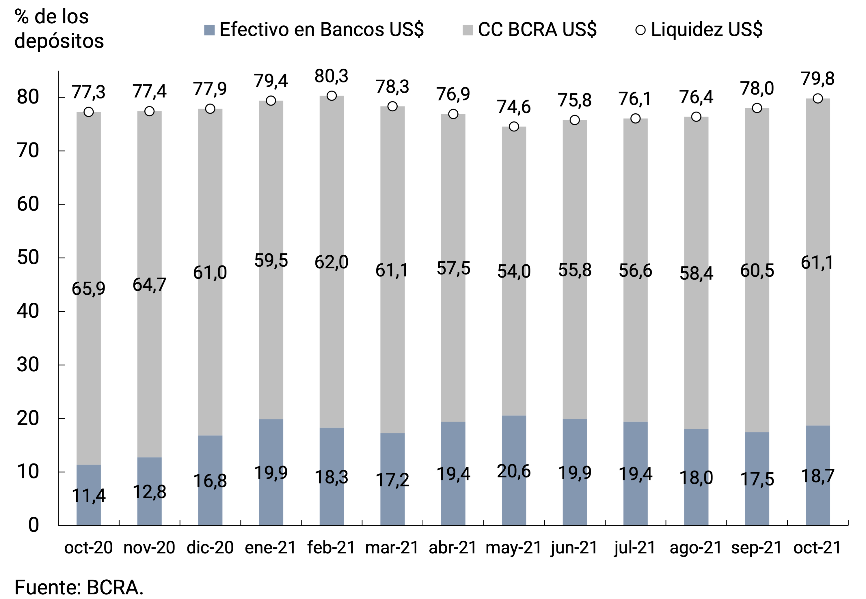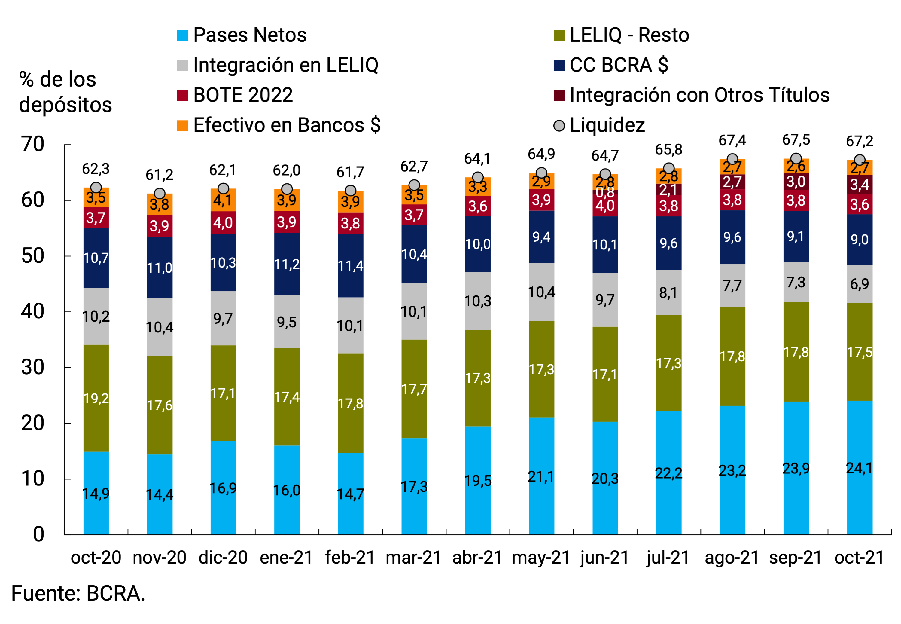 6 Incluye las cuentas corrientes en el BCRA, el efectivo en bancos, los saldos de pases netos concertados con el BCRA, las tenencias de LELIQ y los bonos elegibles para integrar encajes.