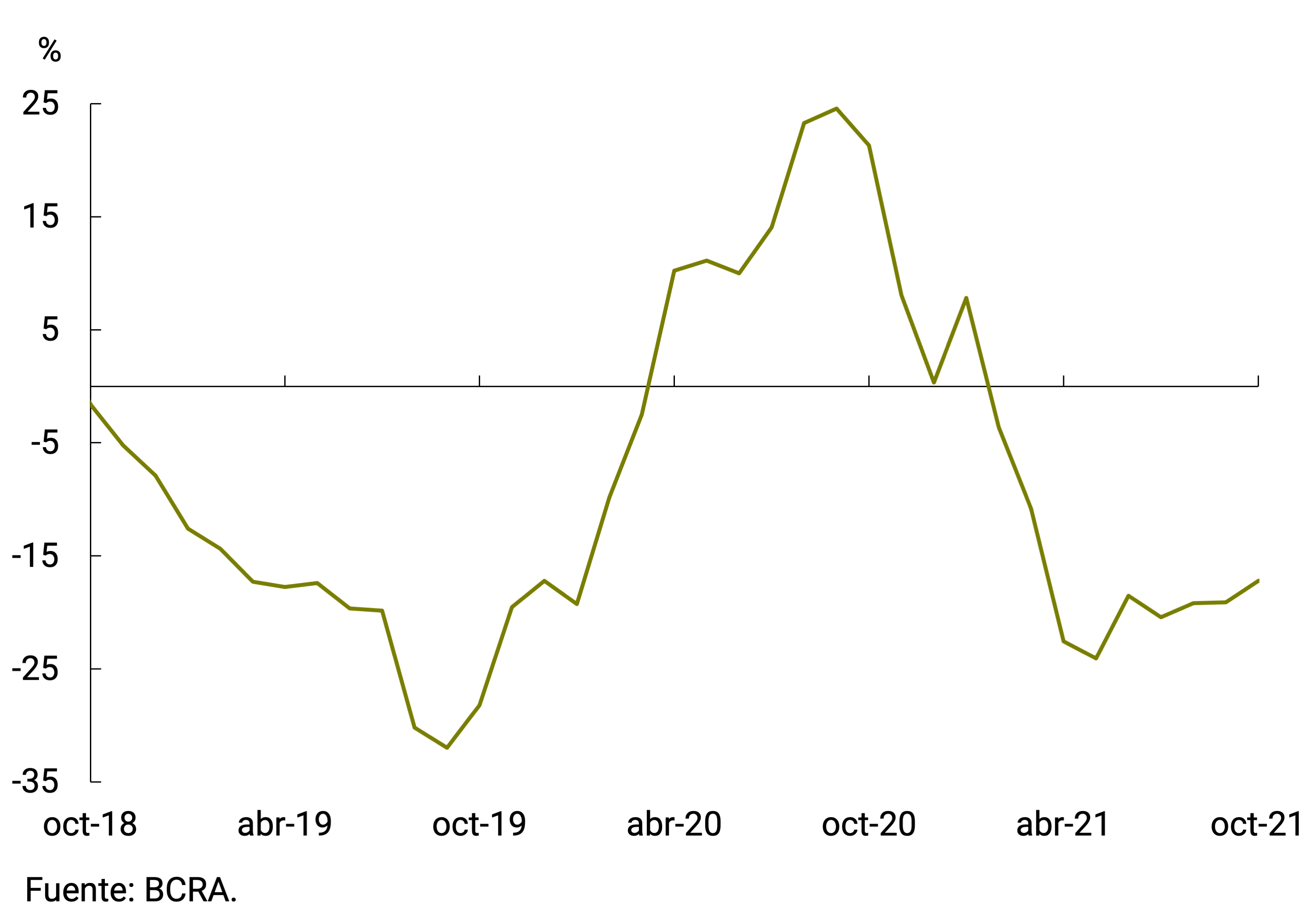 Con todo, el agregado monetario amplio M3 privado4 a precios constantes habría registrado en octubre un aumento de 1,6% s.e., la mayor tasa de crecimiento desde agosto del año pasado. En la comparación interanual este agregado habría presentado una contracción del orden del 5%. En términos del Producto se ubicó en 18,2%, 6,0 p.p. por debajo del máximo de 2020.