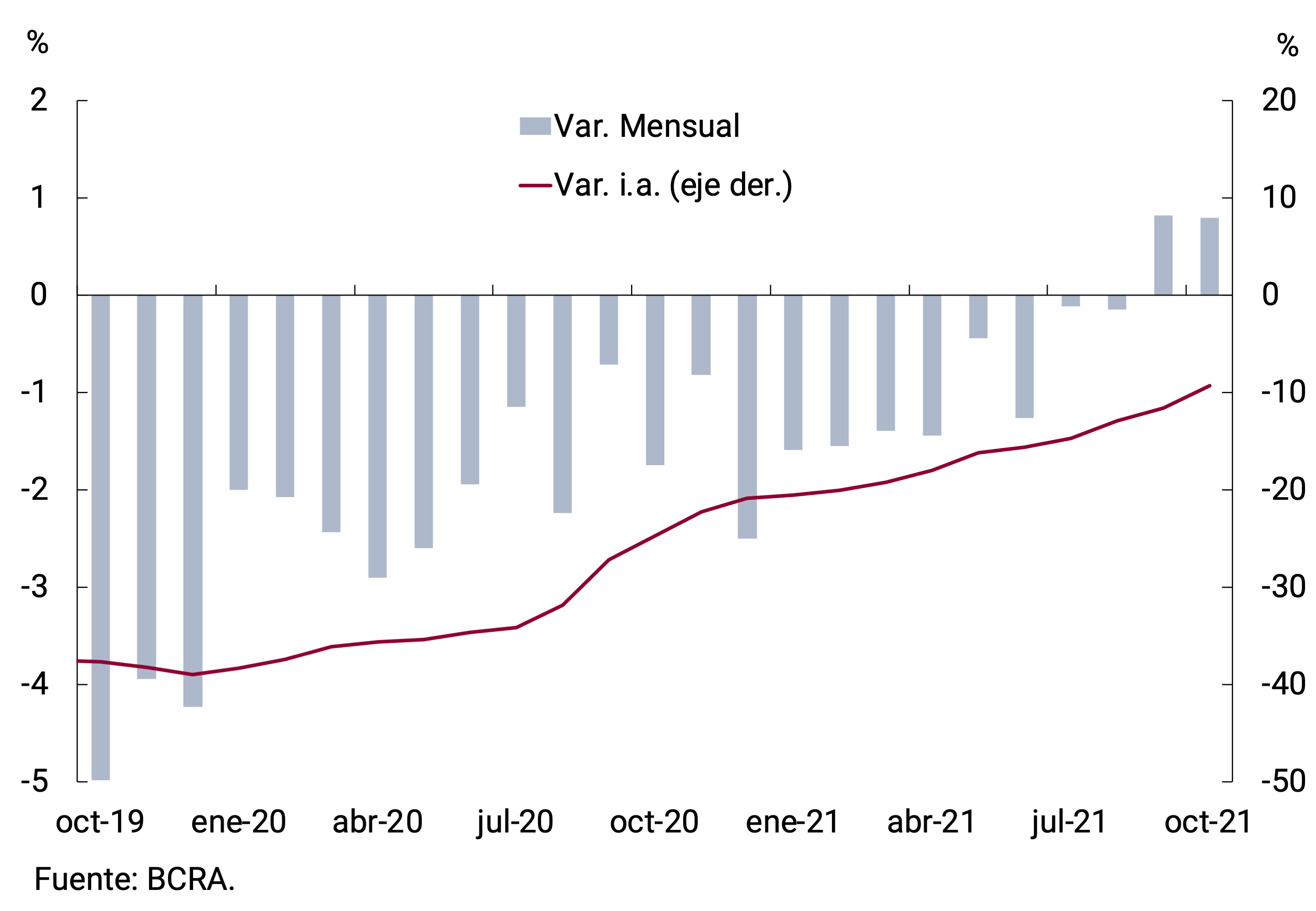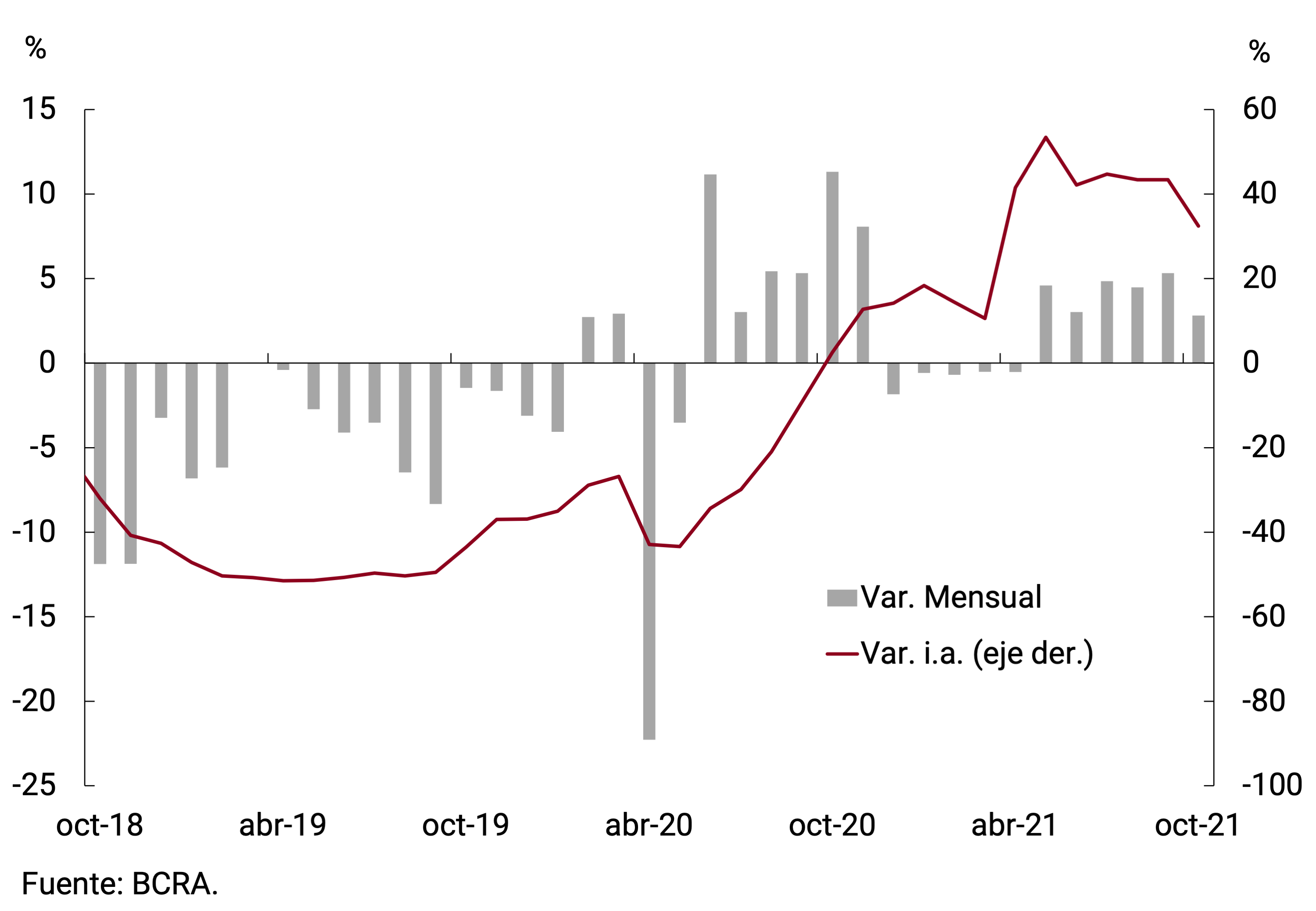Con respecto a las líneas con garantía real, los créditos prendarios habrían registrado en octubre un aumento promedio mensual de 4,5% s.e. en términos reales, acumulando 16 meses consecutivos de variaciones positivas a precios constantes. De este modo el ritmo de expansión interanual real se ubicaría en torno al 35,3%. Por último, el saldo de los préstamos hipotecarios habría exhibido un incremento mensual de 0,6% real sin estacionalidad, aunque ubicándose 21,8% por debajo del registro de octubre pasado.