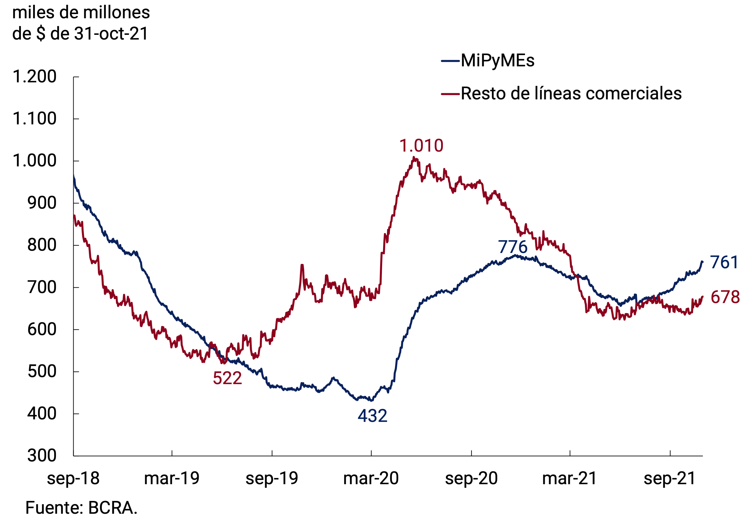 Los préstamos en pesos al sector privado no financiero registraron una tasa de expansión positiva a precios constantes, con aumentos en todas las líneas. Sin embargo, se destacaron particularmente las líneas comerciales de corto plazo (documentos descontados y adelantos).