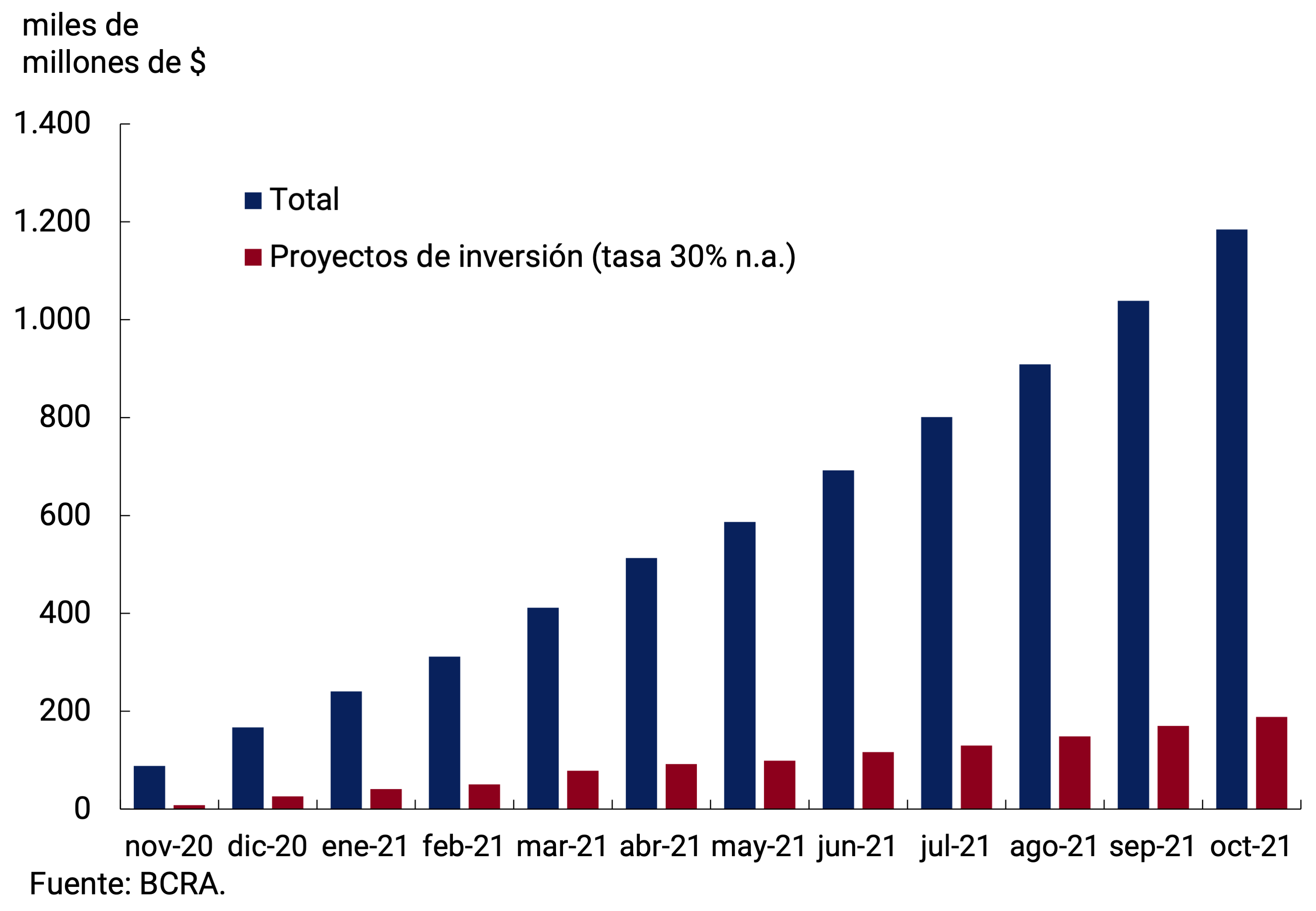 En octubre, los préstamos otorgados en el marco de la LFIP aumentaron $149.300 millones. Así, los desembolsos acumulados desde su implementación totalizaron unos $1.187 miles de millones. En lo que respecta a los destinos de estos fondos, alrededor del 84% del total desembolsado corresponde a la financiación de capital de trabajo y el resto a la línea que financia proyectos de inversión (ver Gráfico 5.5). Al momento de esta publicación el número de empresas que accedió a la LFIP ascendió a alrededor de 183.700. Cabe recordar que este mes entró en vigor el Cupo 2021/2022 de la LFIP. Este nuevo tramo incorpora algunas modificaciones respecto de los anteriores, brindándole un mayor alcance5.