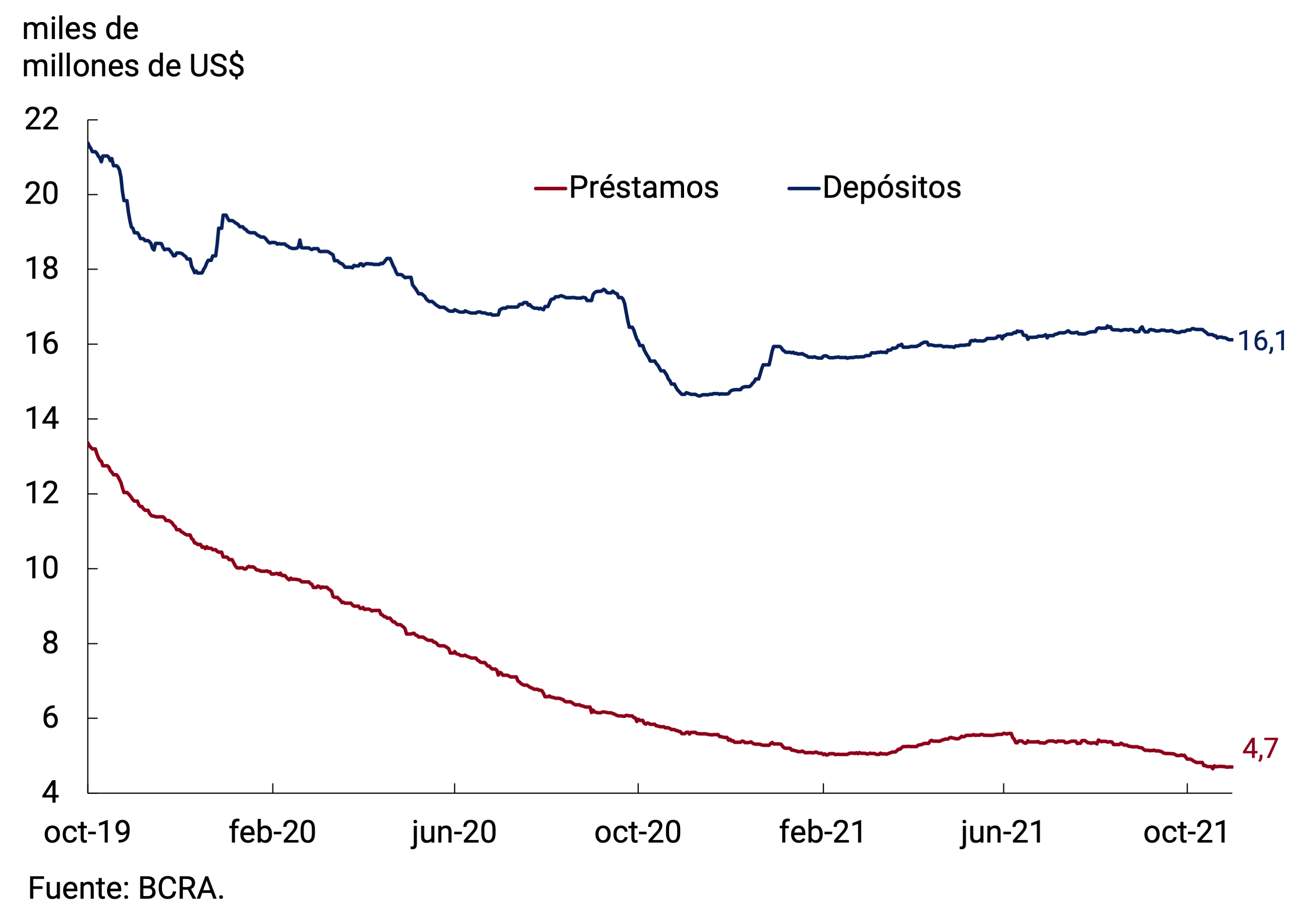 En lo que refiere al segmento en moneda extranjera, los principales activos y pasivos de las entidades presentaron variaciones negativas (ver Gráfico 7.1). Los préstamos al sector privado continuaron con la tendencia bajista del mes previo. Así, alcanzaron un saldo promedio mensual de US$4.761 millones, unos US$322 millones por debajo del saldo de septiembre. La caída se concentró en las financiaciones instrumentadas mediante documentos a sola firma, línea destinada mayormente a la prefinanciación de exportaciones. Por su parte, los depósitos del sector privado comenzaron a caer en la segunda parte del mes. De este modo, el saldo promedio mensual se ubicó en US$16.273 millones, lo que implicó una caída de alrededor de US$80 millones respecto de septiembre.