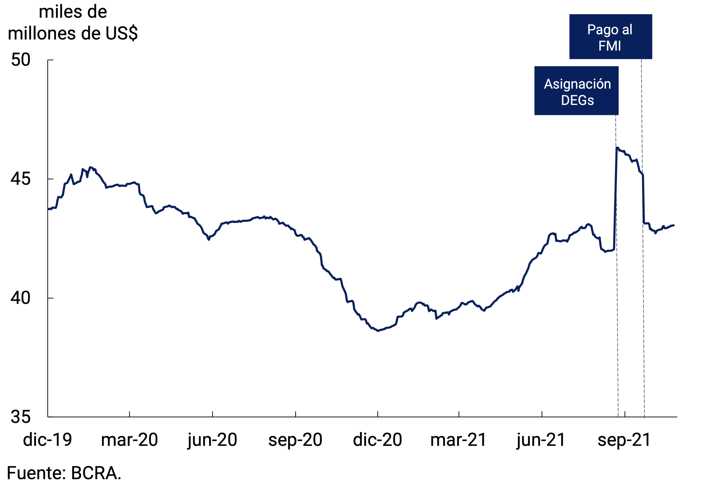 Las Reservas Internacionales del BCRA finalizaron octubre con un saldo de US$42.817 millones, lo que significó una disminución de US$94 millones respecto al cierre del mes previo (ver Gráfico 7.3). Las compras netas de divisas al sector privado, que alcanzaron US$207 millones en el mes, y la posición de efectivo mínimo de los bancos aportaron positivamente a la variación de las reservas, compensando parcialmente el aporte negativo del resto de los componentes.