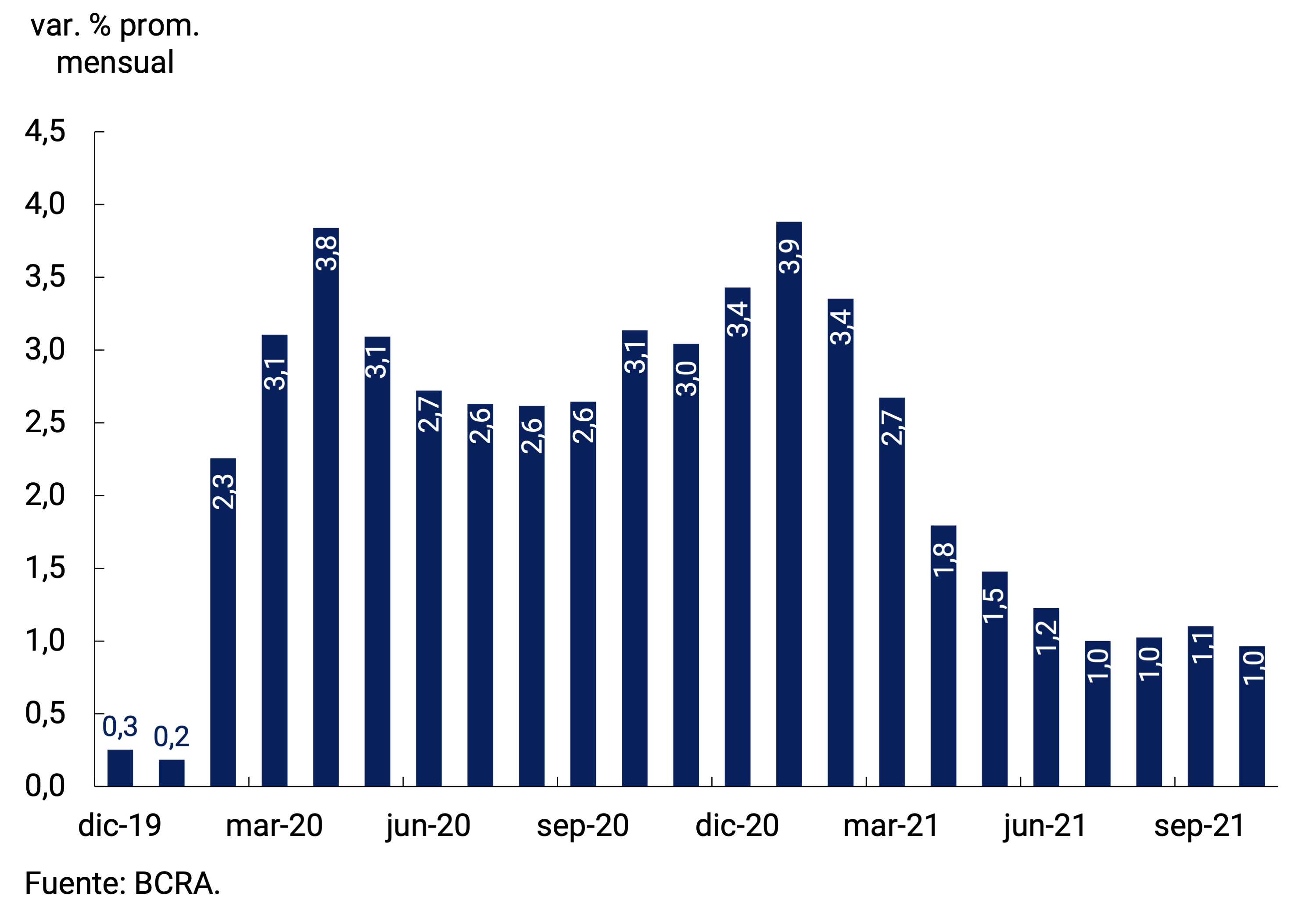 M2 privado: Medios de pago, comprende el circulante en poder del público, los cheques cancelatorios en pesos y los depósitos a la vista en pesos del sector privado no financiero.