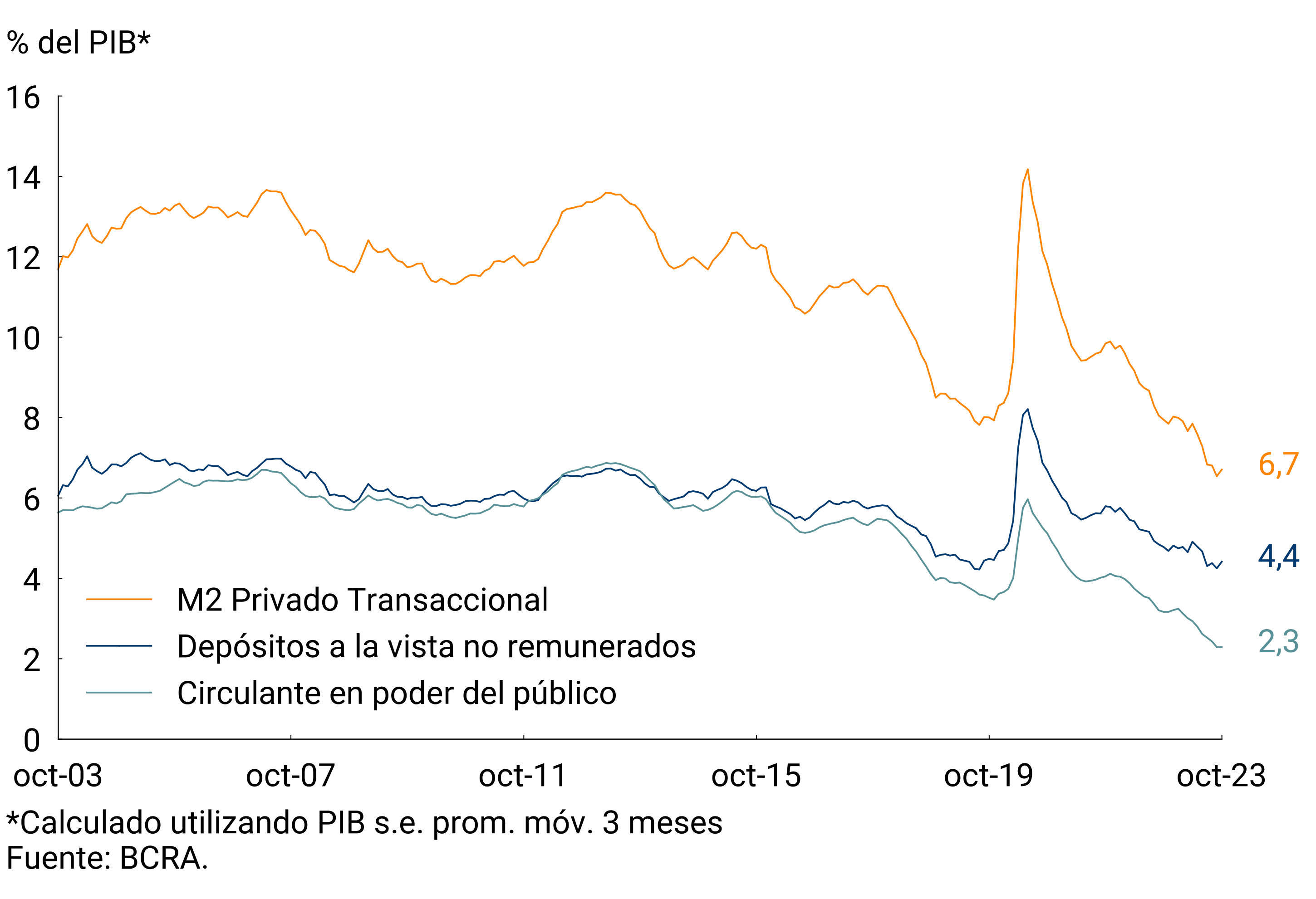 1 Corresponde al M2 privado excluyendo depósitos a la vista remunerados de empresas y prestadoras de servicios financieros. Se excluyó este componente dado que se asemeja más a un instrumento de ahorro que a un medio de pago.