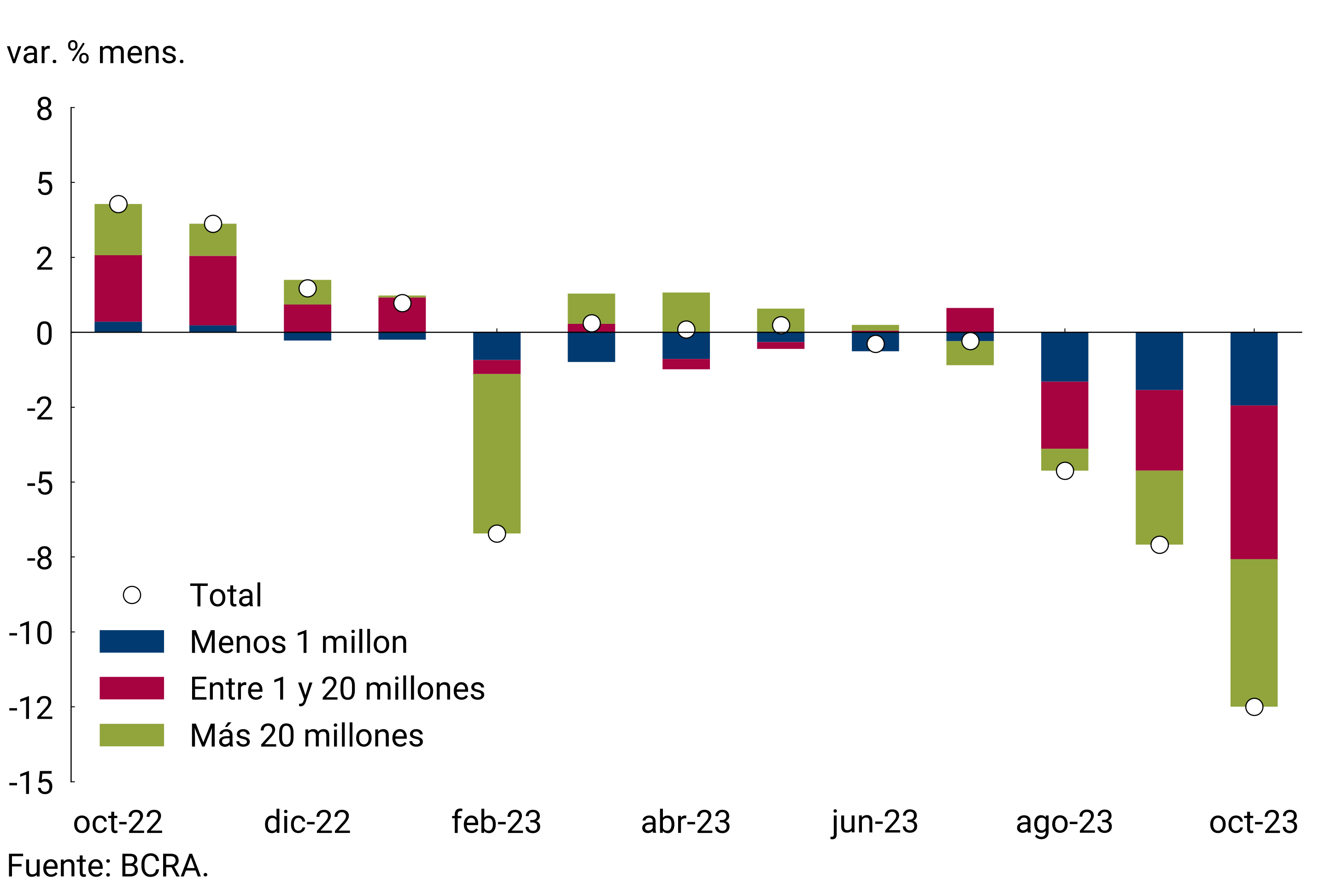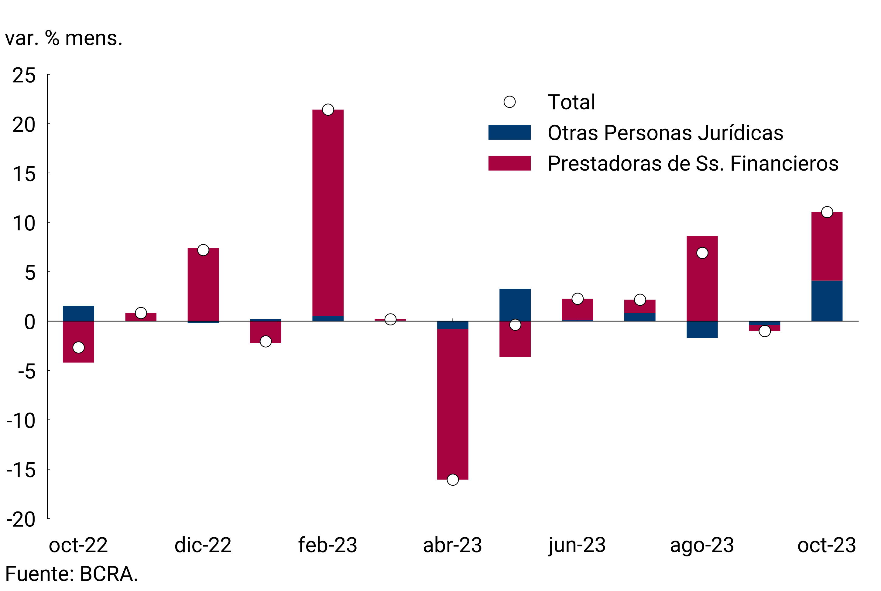 Por último, los préstamos comerciales en pesos al sector privado crecieron en términos reales y sin estacionalidad en el mes de octubre, dinámica que fue parcialmente compensada por la contracción de las restantes líneas de crédito. Con todo, el saldo de préstamos registró un aumento luego de dos meses de bajas pronunciadas.