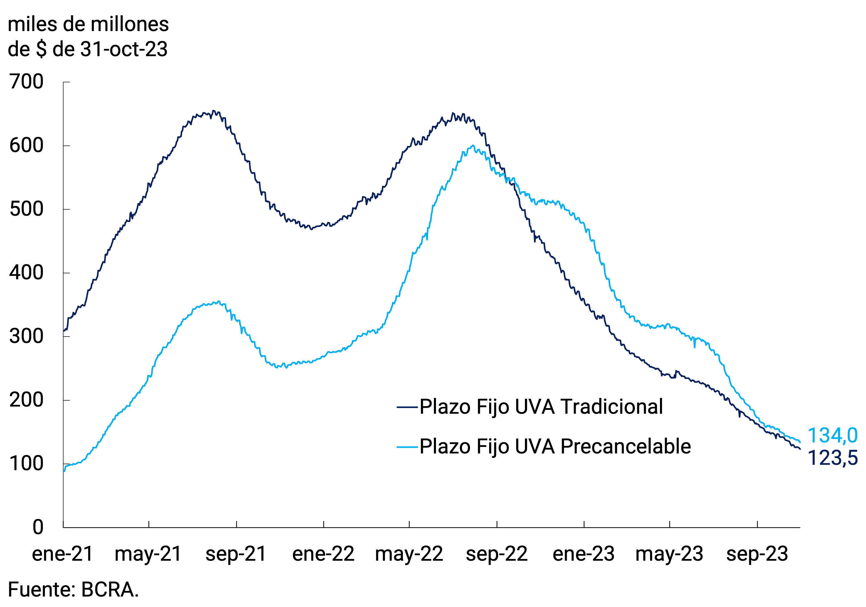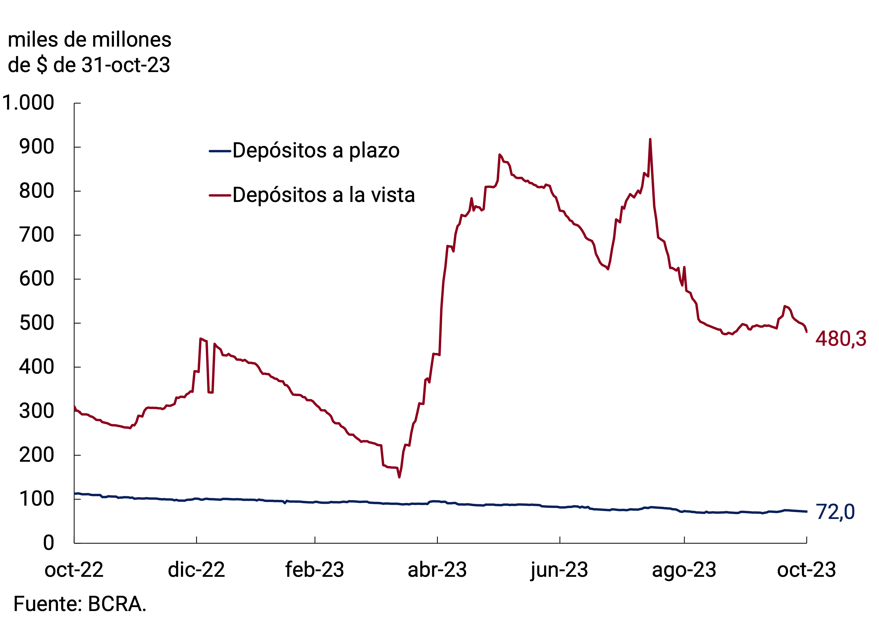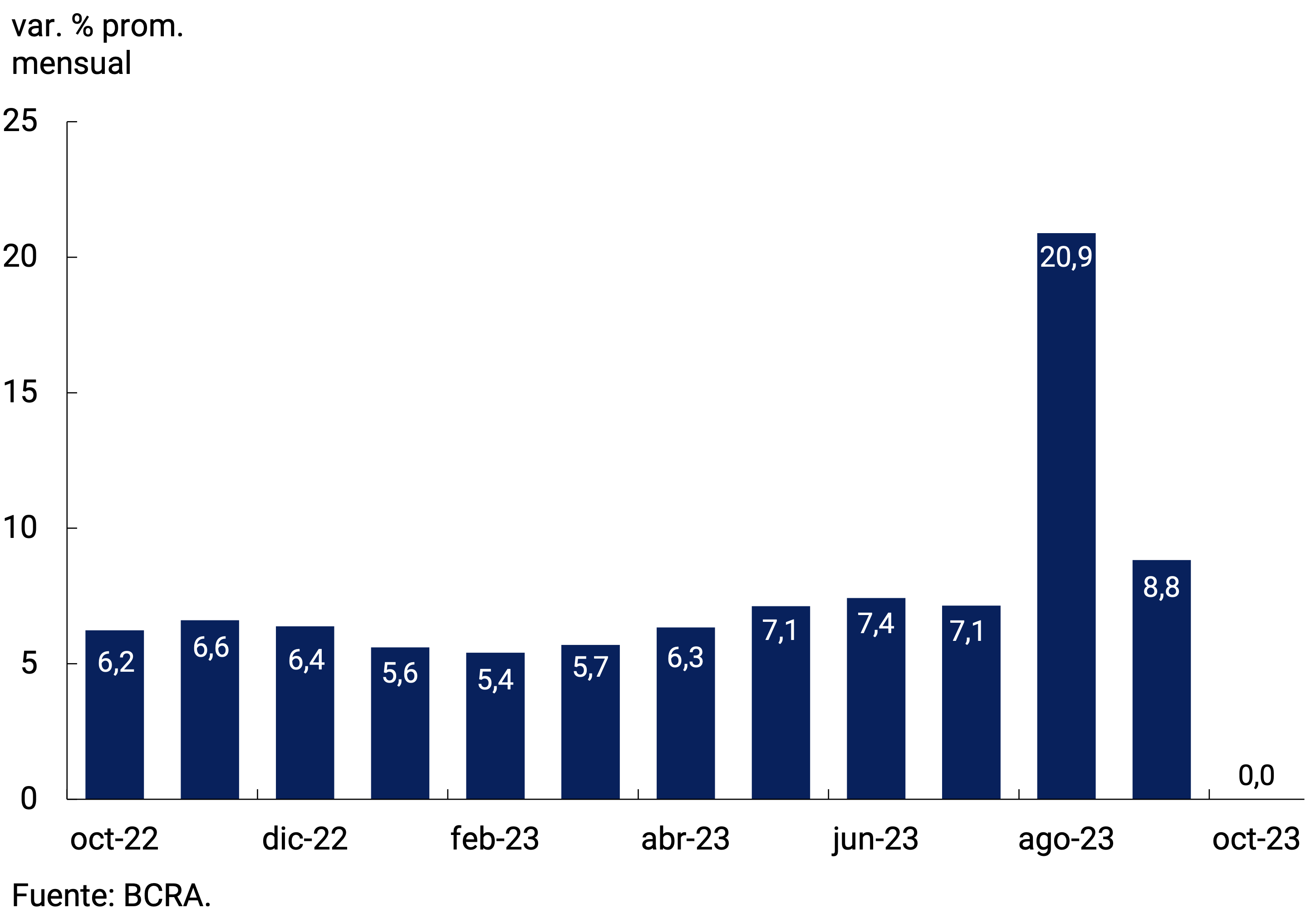 A mediados de octubre el BCRA elevó en 15 puntos porcentuales (p.p.) la tasa de interés de política monetaria (LELIQ 28 días), llevándola a 133% n.a. (254,8% e.a.). También elevó las tasas de interés del resto de los instrumentos de regulación monetaria y las tasas de interés mínimas de depósitos a plazo fijo. Con esta suba, se buscó propender hacia retornos reales positivos sobre las colocaciones a plazo en moneda local, a los efectos de sostener su demanda, que había comenzado a mostrar una tendencia decreciente.