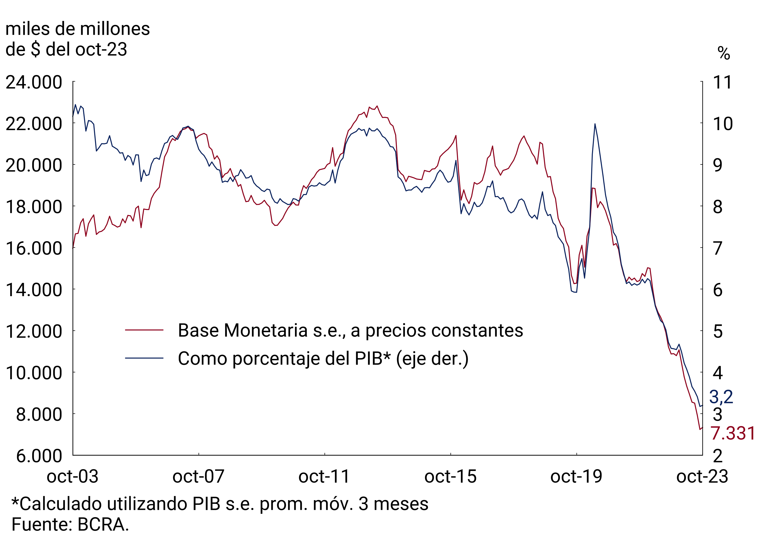 En octubre, el saldo promedio de la Base Monetaria fue de $7.203 miles de millones, lo que implicó una expansión mensual de 10,2% ($670 mil millones) a precios corrientes. No obstante, ajustada por estacionalidad y a precios constantes habría exhibido una expansión de 1,3%, acumulando en los últimos doce meses una caída del 32,6%. Como ratio del PIB, la Base Monetaria se ubicaría en 3,2%, manteniéndose estable respecto al guarismo de septiembre y situándose en su mínimo valor desde la salida de la convertibilidad (ver Gráfico 4.1).