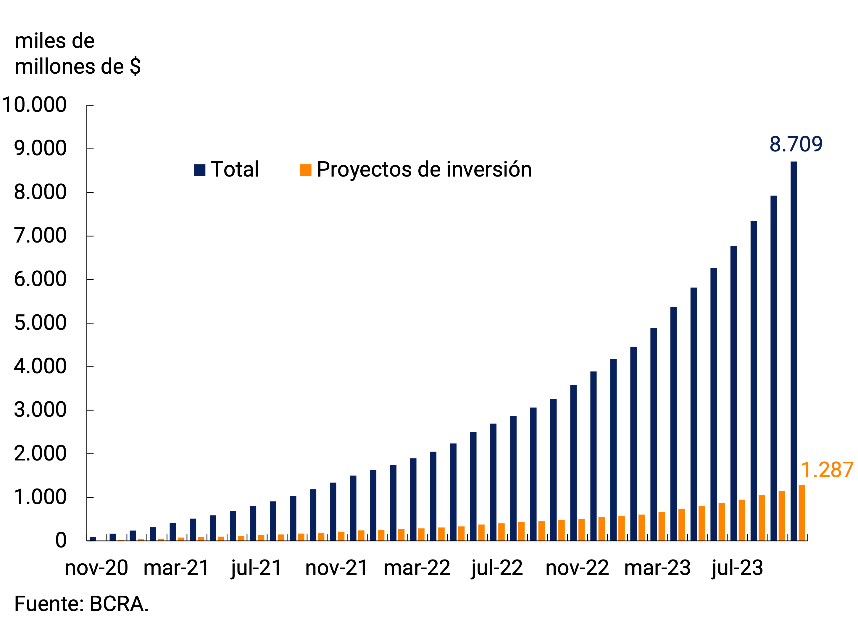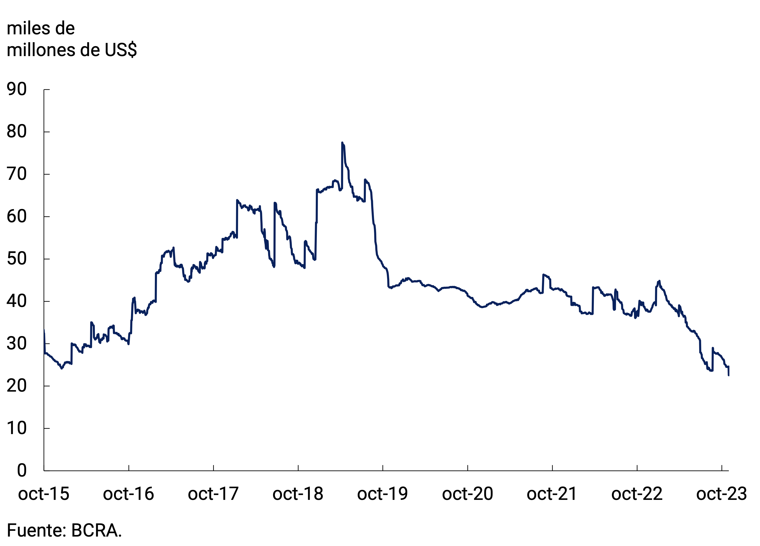 En el mes tuvieron lugar una serie de modificaciones normativas en materia cambiaria en lo relativo al acceso al mercado de cambios. Entre ellas, se destaca una normativa que favorece a las PyMEs que importan insumos y bienes de capital para sus actividades productivas6, 7. A su vez, con el objetivo de incrementar la oferta de divisas, en los últimos días del mes, se estableció, con vigencia hasta el 17 de noviembre de 2023, la obligación de ingresar y liquidar en el Mercado Único y Libre de Cambios (MULC) un 70% del contravalor en divisas de los bienes exportados y los cobros de servicios prestados a no residentes alcanzados, así como los anticipos, prefinanciaciones y postfinanciaciones del exterior, dejando el 30% restante para concretar operaciones de compraventa con valores negociables adquiridos con liquidación en moneda extranjera y vendidos con liquidación en moneda local8. El BCRA sancionó normativas complementarias de estos decretos9, como la posibilidad de acreditar los fondos en pesos resultantes en una cuenta cuya retribución se determine en función de la evolución del tipo de cambio o destinarlos a la suscripción de letras liquidables en pesos por el Tipo de Cambio de Referencia10.