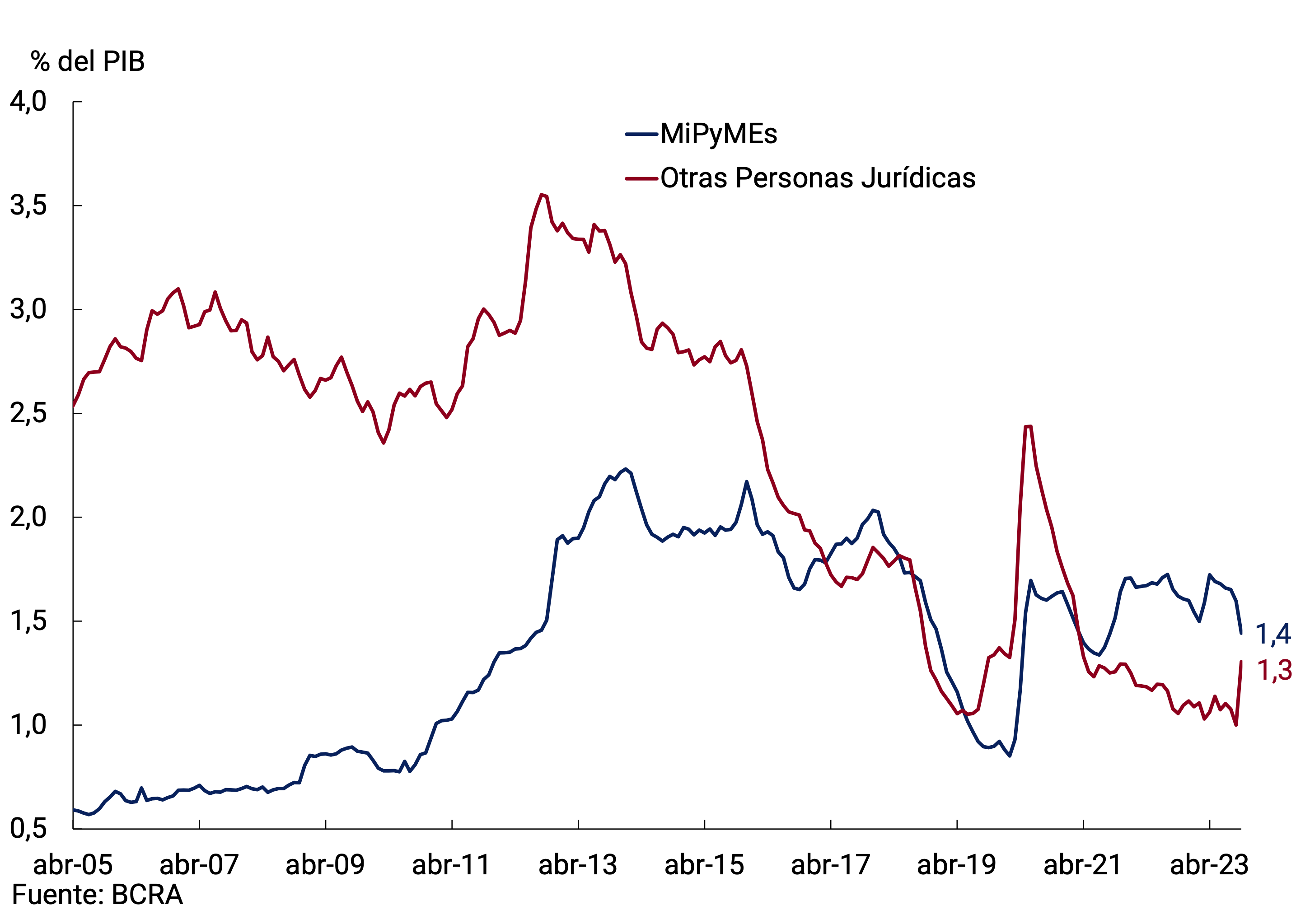 Distinguiendo los préstamos comerciales según tipo de deudor, el crédito a las MiPyMEs se ubicó en torno a 1,4% del PIB, levemente por encima del registro previo a la pandemia y del promedio histórico. En el caso de las grandes empresas, el ratio de crédito a PIB se ubica en torno a 1,3% del PIB, mostrando un aumento respecto a los meses previos (ver gráfico 5.4).