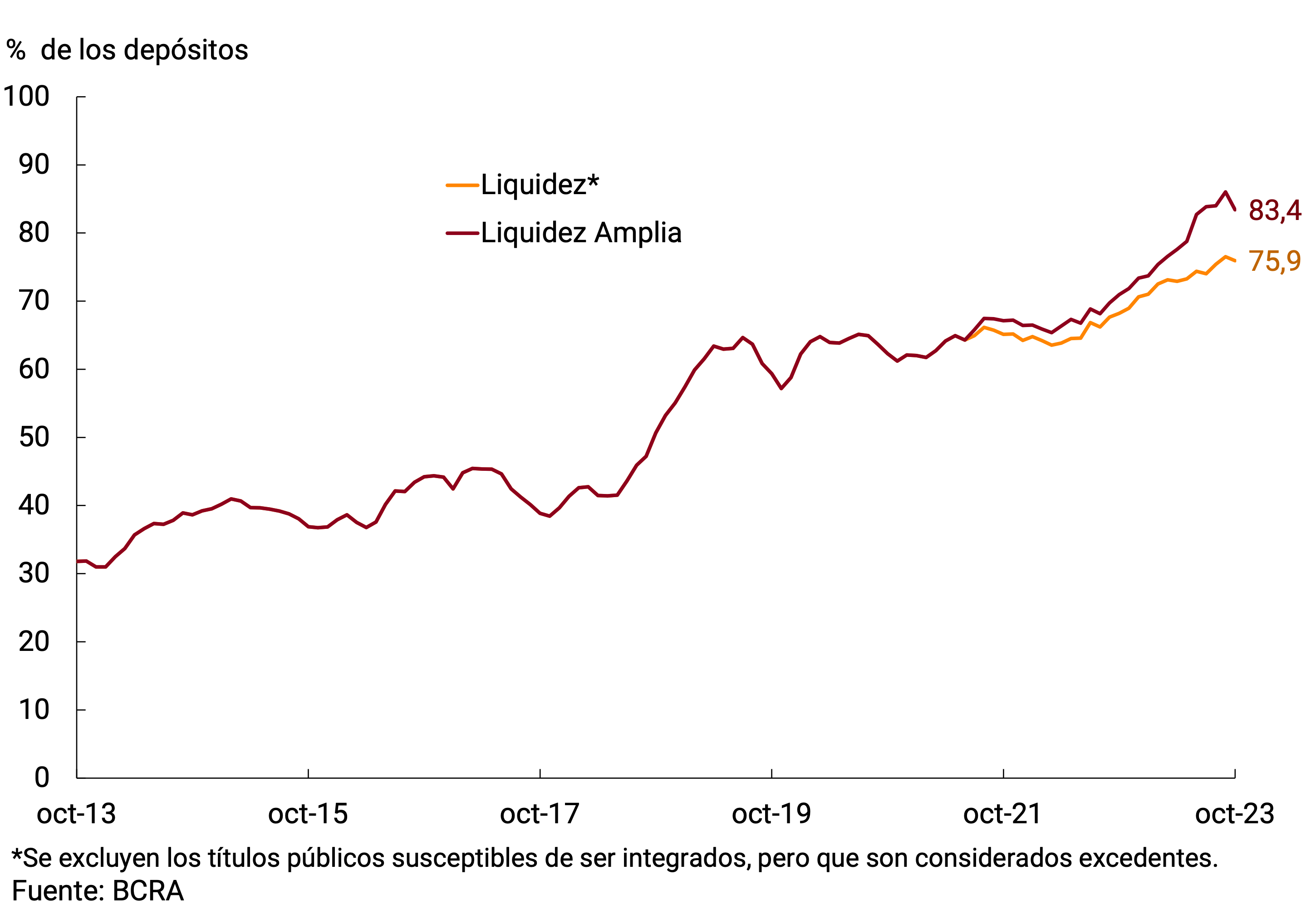 En octubre, la liquidez bancaria amplia en moneda local5 se redujo 2,5 p.p. con respecto del mes de septiembre, promediando 83,4% de los depósitos (ver Gráficos 6.1 y 6.2). De todos modos, permaneció en niveles históricamente elevados. La caída se explicó por la disminución de los pasivos remunerados del Banco Central y los títulos públicos para integración de efectivo mínimo.