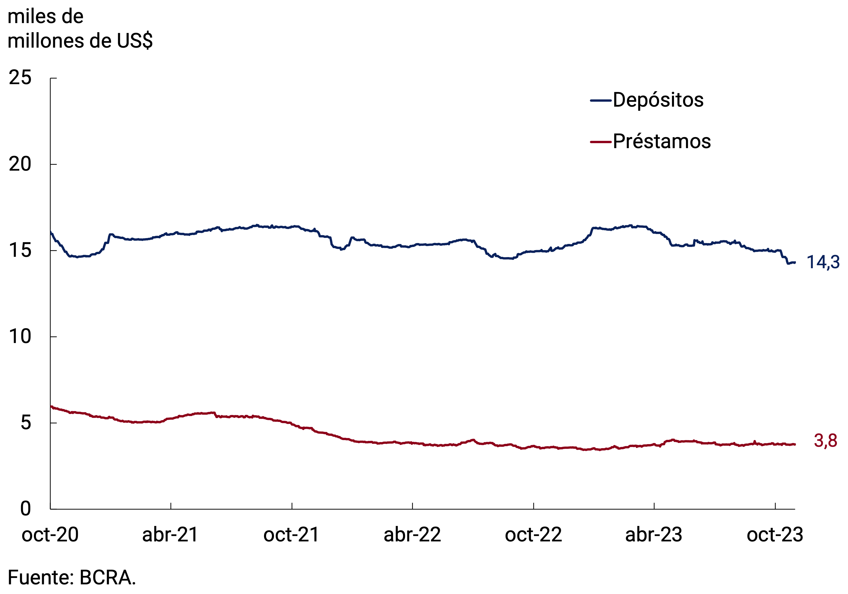 En el segmento en moneda extranjera, los principales activos y pasivos de las entidades financieras tuvieron un desempeño dispar. Por un lado, los depósitos del sector privado presentaron una caída de US$623 millones en el mes y finalizaron octubre con un saldo de US$14.315 millones. Esta caída se concentró en los depósitos de personas humanas. Por otro lado, el saldo de los préstamos al sector privado se mantuvo prácticamente sin cambios y finalizó el mes en US$3.753 millones (ver Gráfico 7.1).