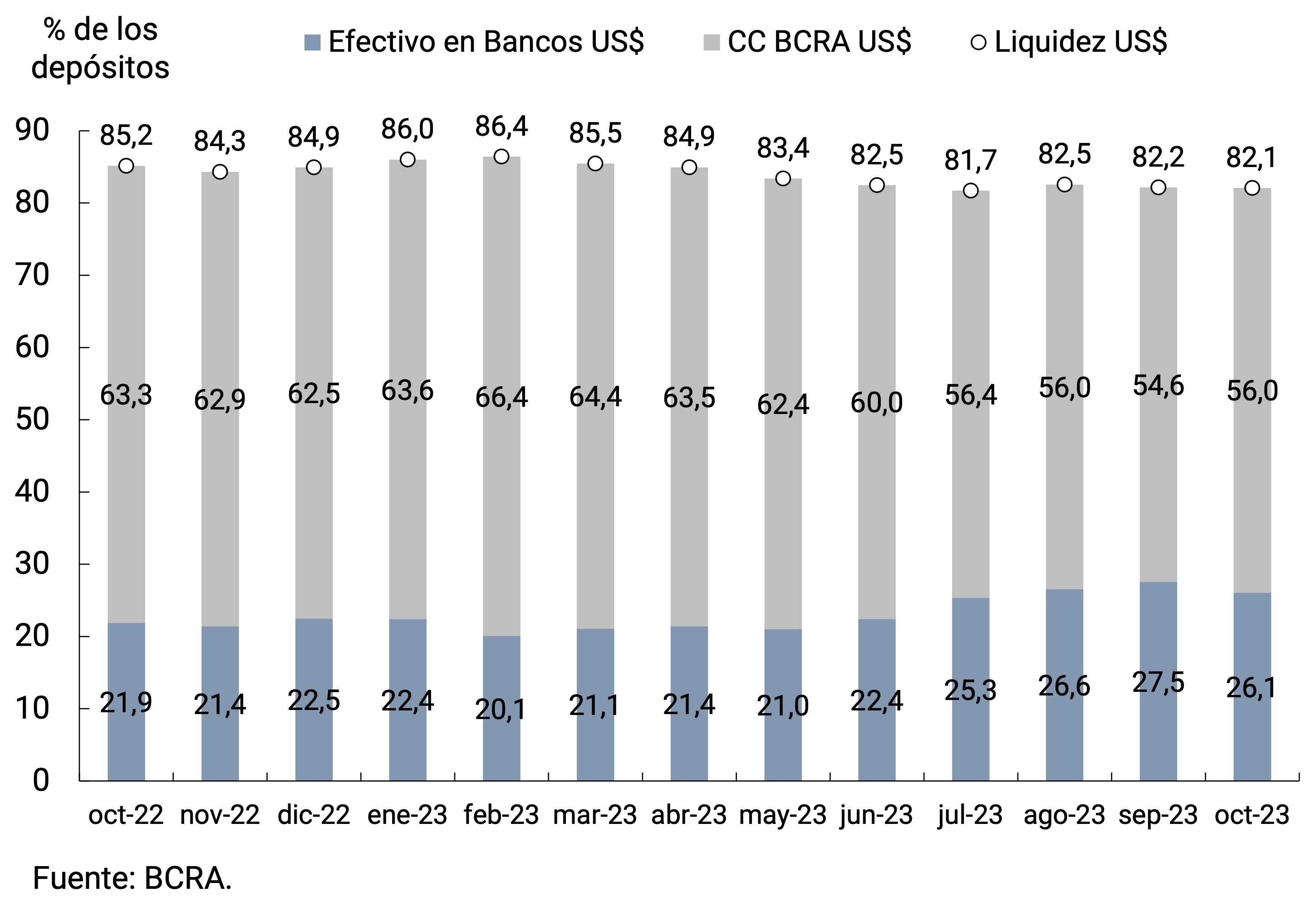 5 Incluye las cuentas corrientes en el BCRA, el efectivo en bancos, los saldos de pases netos concertados con el BCRA, las tenencias de LELIQ y NOTALIQ y los bonos públicos elegibles para integrar encajes.