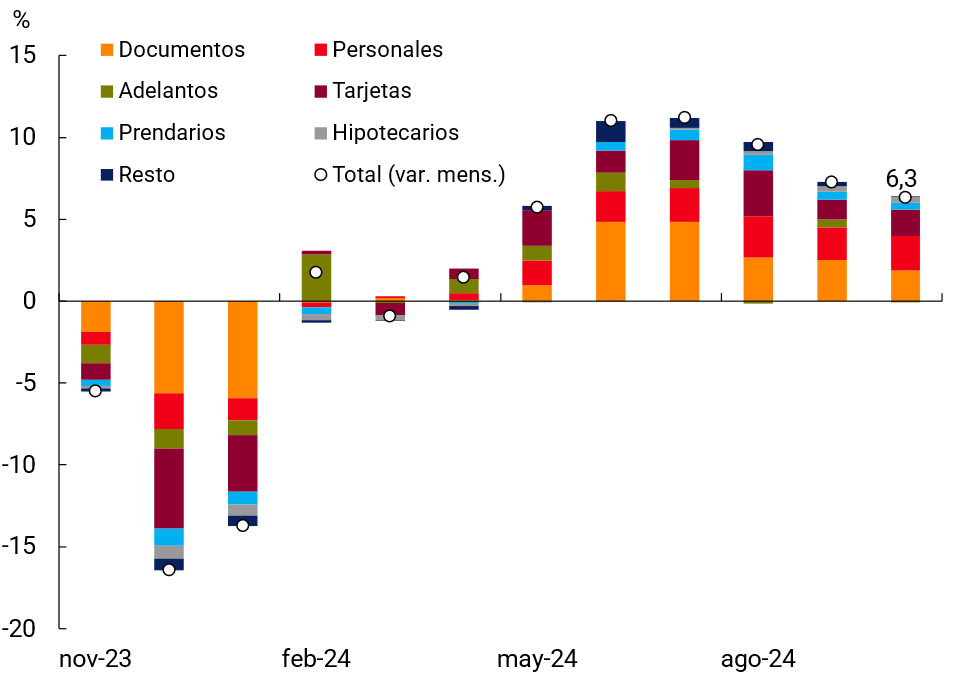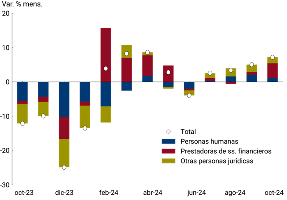 Los préstamos comerciales se expandieron nuevamente, aunque a un ritmo más acotado, y acumulan 9 meses consecutivos de crecimiento. Durante octubre los préstamos comerciales en conjunto aumentaron en términos reales 3,8% mensual s.e., impulsados por los créditos instrumentados a través de documentos, que crecieron 6,1% mensual s.e. en términos reales y se encuentran 11,5% por encima del nivel registrado un año atrás. Tanto los documentos a sola firma como los documentos descontados mostraron una evolución favorable en el mes con aumentos reales de 7,1% y 3,9%, respectivamente. Los adelantos en cuenta corriente resultaron la única línea de crédito que no creció en el mes con una leve caída de 0,8% real s.e. respecto a septiembre, aunque se ubican 13,5% por encima del nivel de un año atrás. Dentro de los préstamos comerciales, cuando se los analiza según el tipo de deudor, se observa que el crecimiento de las líneas comerciales viene dado en mayor parte por el crédito destinado a grandes empresas, que se expandió aproximadamente 6% real s.e. durante octubre y ya se encuentra 129% por encima del stock de un año atrás. El crédito comercial destinado a PyMEs creció en el mes 1,5% en términos reales y sin estacionalidad y resulta todavía 17,4% inferior al nivel de octubre de 2023.
