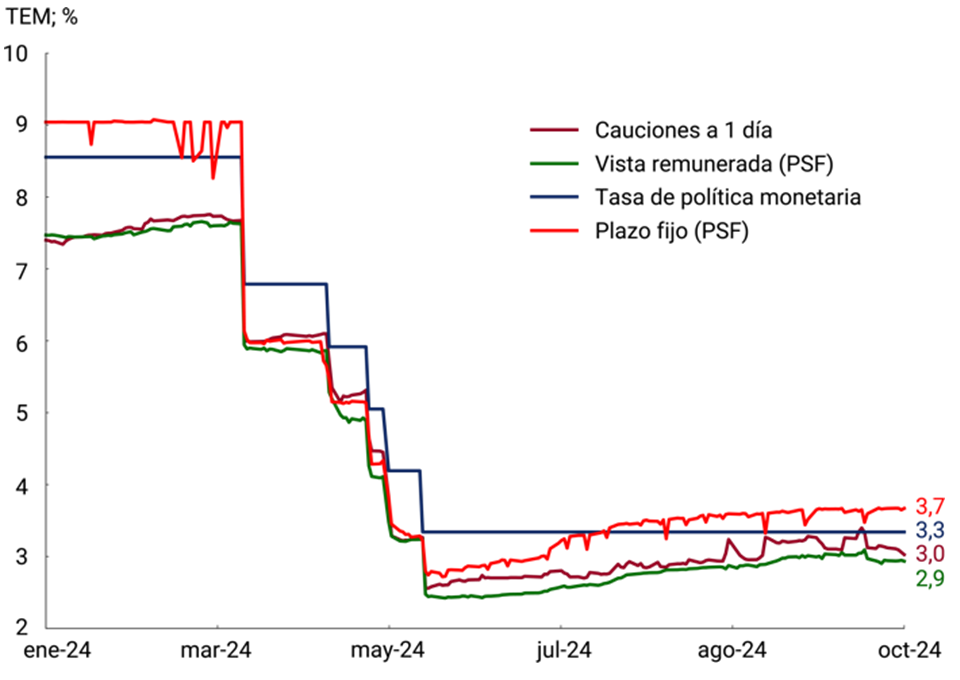 En función de las condiciones de liquidez, la baja observada en tasa de inflación y en las expectativas de inflación manifestadas tanto en el REM como en los niveles implícitos en el mercado secundario de títulos, y el afianzamiento del ancla fiscal, el BCRA bajó la tasa de interés de política monetaria y la de pases activos en 5 p.p. Así, a partir de noviembre, dichas tasas pasaron situarse en 35% n.a. y 40% n.a., respectivamente.