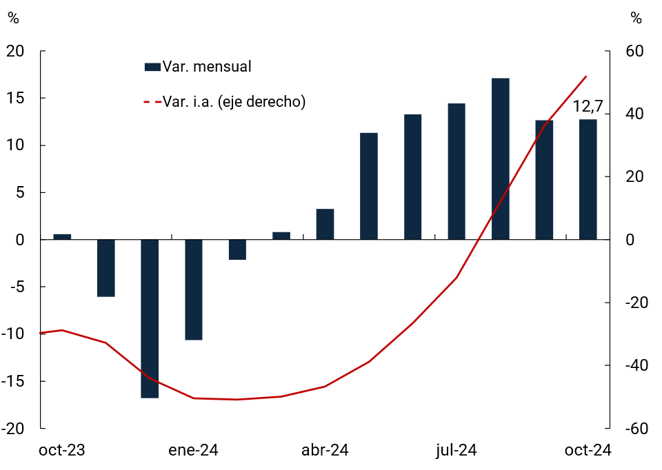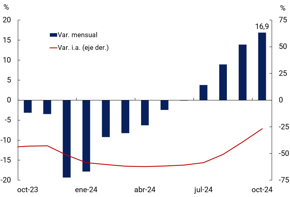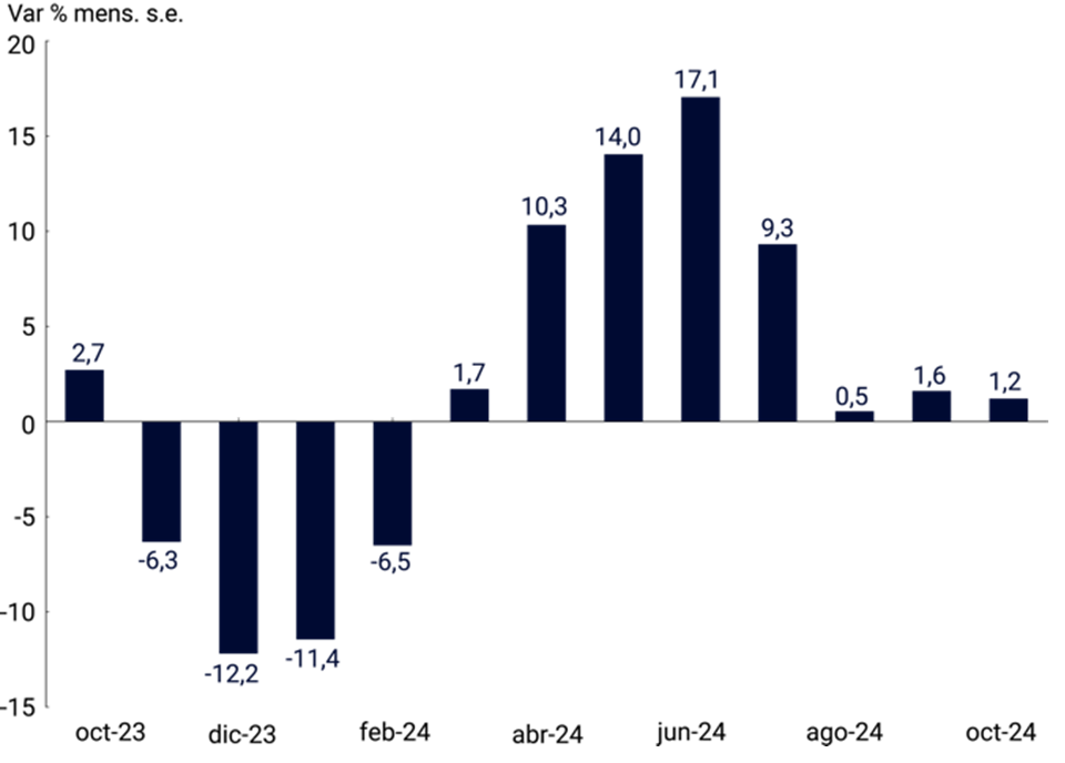 Los préstamos con garantía real lideraron el crecimiento del mes con un incremento real de 10,0% s.e. mensual. Al igual que en septiembre, la línea de crédito que mostró el mejor desempeño fueron los hipotecarios, que crecieron 16,9% s.e. a precios constantes, aunque todavía se encuentran 26,4% por debajo del nivel de un año atrás (ver Gráfico 3.2.3). Por su parte, los préstamos prendarios aumentaron 7,2% real s.e. respecto a septiembre y ya se encuentran 6,0% por encima del nivel de octubre de 2023.