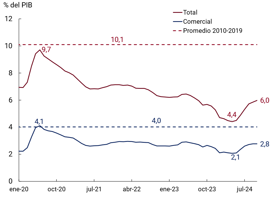 El agregado monetario amplio, M3 privado1 registró un aumento de 3,0% mensual a precios constantes y ajustado por estacionalidad, superior al de los dos meses anteriores. Así, la demanda de dinero continuó mostrando una recuperación desde los niveles mínimos registrados a comienzos de 2024, en un contexto de consolidación del descenso de la tasa de inflación y de una mejoría de los indicadores adelantados de actividad. En términos del PIB, el agregado amplio se ubicó en 11,4%, aunque todavía exhibe un descenso de 18,7% en la comparación interanual.