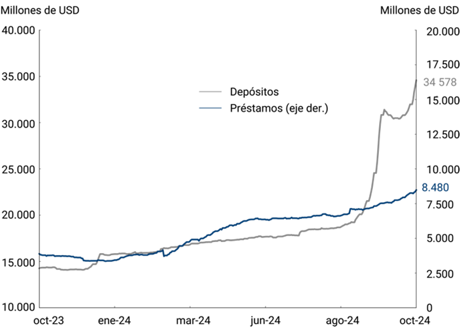 Así, el saldo de depósitos en moneda extranjera del sector privado se ubicó en USD34.578 millones, exhibiendo un crecimiento de USD15.970 millones desde mediados de agosto. De este modo, alcanzó un nuevo máximo histórico, superando al de mediados de 2019. Por su parte, los préstamos al sector privado presentaron un aumento de USD943 millones, cerrando el mes en USD8.480 millones y de este modo, acumulan un crecimiento cercano a USD1.870 millones desde el 15 de agosto.