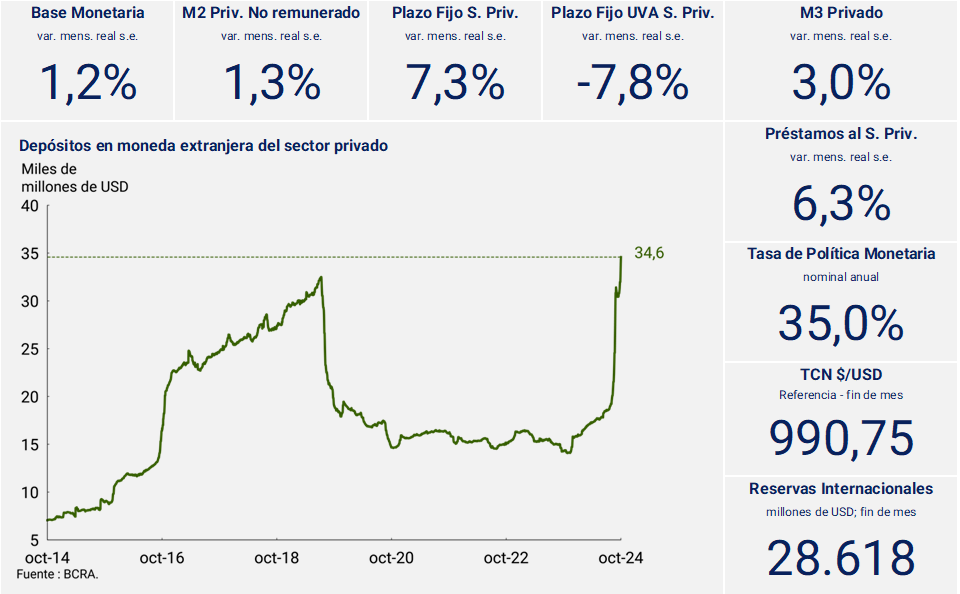 En el segmento en moneda extranjera, se destacó el crecimiento de los depósitos en el marco del “Régimen de Regularización de Activos”. En octubre exhibieron un aumento de USD3.170 millones y acumulan USD15.970 millones desde mediados de agosto. De este modo, el saldo de depósitos alcanzó un nuevo máximo histórico, superando al de mediados de 2019.