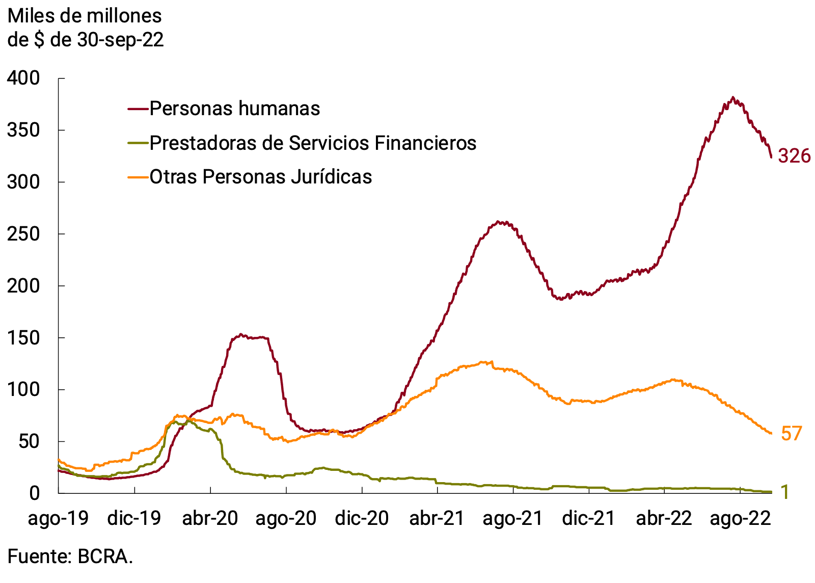 Cabe destacar que a mediados de mes el Directorio del BCRA decidió elevar por novena vez en el año las tasas de interés mínimas garantizadas de los depósitos a plazo fijo2. En esta oportunidad, incrementó en 5,5 p.p. la tasa mínima garantizada para las colocaciones de personas humanas por hasta un monto de $10 millones, que pasó a ubicarse en 75% n.a. (107,05% e.a.). Para el resto de las y los depositantes del sistema financiero3 la tasa de interés se elevó en la misma magnitud hasta 66,5% n.a. (91,07% e.a.). Esta medida está orientada a propender hacia retornos reales positivos para incentivar el ahorro en moneda doméstica.