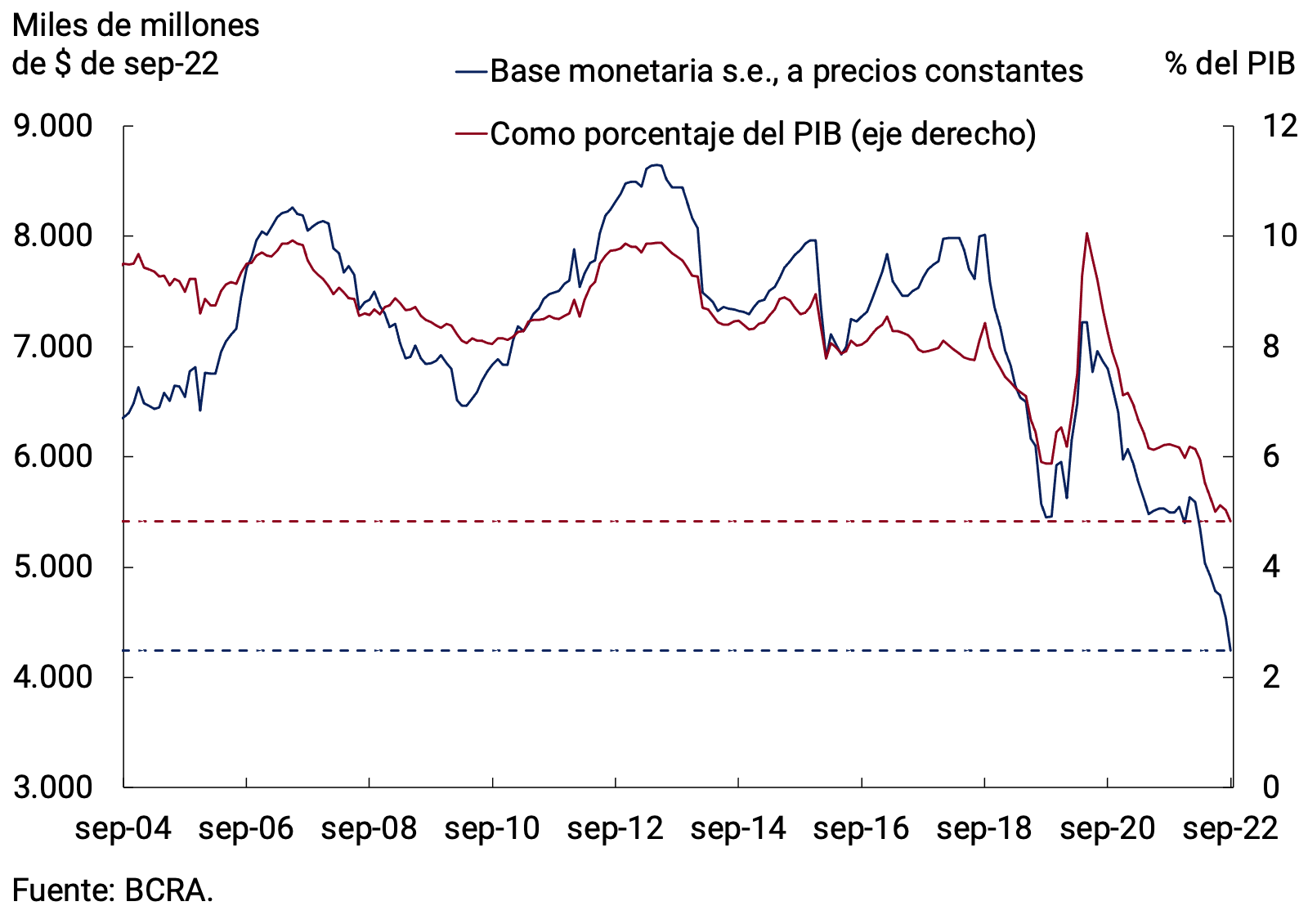 En septiembre, la Base Monetaria se ubicó en promedio en $4.179,9 miles de millones, registrando una contracción mensual de 2,5% ($107.357 millones) en la serie original a precios corrientes. Ajustada por estacionalidad y a precios constantes, habría exhibido una contracción de 6,5% y en los últimos doce meses acumularía una caída del orden del 23%. En términos del PIB la Base Monetaria se ubicaría en 4,8%, 1,2 p.p. por debajo del guarismo de diciembre y el mínimo valor desde 2003 (ver Gráfico 4.1).
