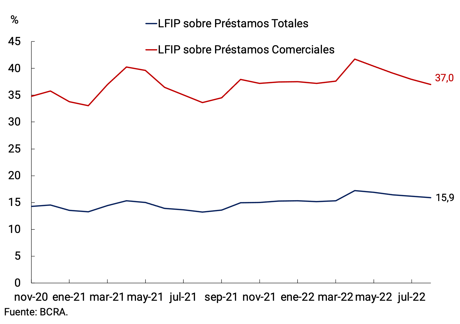 La Línea de Financiamiento para la Inversión Productiva (LFIP) continuó siendo la principal herramienta utilizada para canalizar el crédito productivo a Micro, Pequeñas y Medianas Empresas (MiPyMEs). A fines de septiembre, los préstamos otorgados en el marco de la LFIP acumularon desembolsos por aproximadamente $3.065 miles de millones desde su lanzamiento, con un incremento de 7% respecto al mes pasado. Cabe señalar que, el saldo promedio de las financiaciones otorgadas mediante la LFIP alcanzó aproximadamente a $900.000 millones en agosto (última información disponible), de los cuales el 40,5% correspondió a proyectos de inversión y el resto a capital de trabajo. Dicho saldo representó cerca de un 16% de los préstamos totales y 37% del total de los préstamos comerciales (ver Gráfico 5.3). Al momento de esta publicación, el número de empresas que accedió a la LFIP ascendió a 304.680. En línea con el aumento de las tasas de interés de referencia del BCRA, se elevó la tasa máxima de la línea para financiar capital de trabajo desde 69% a 74,5% n.a.; y la correspondiente a proyectos de inversión pasó de 59% a 64,5% n.a. Cabe señalar que recientemente se renovó la vigencia de esta línea hasta el 31 de marzo de 2023, bajo condiciones similares a las de la anterior edición5.