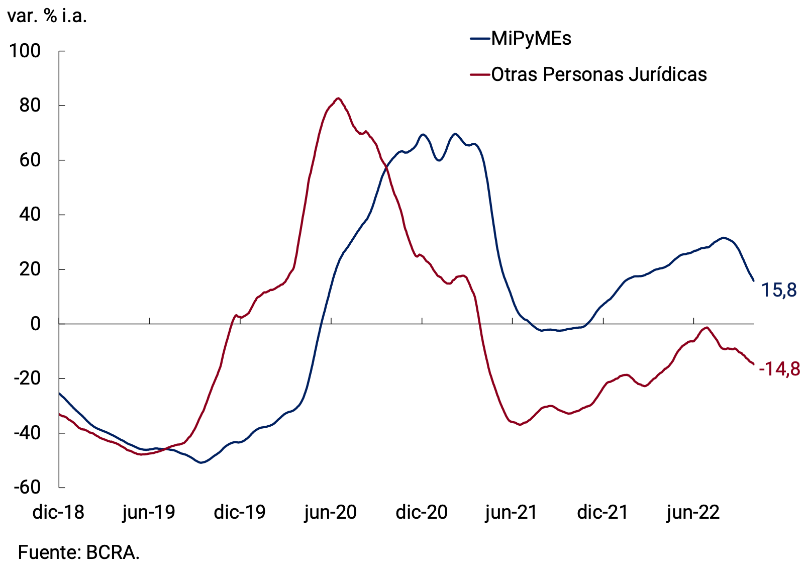 Diferenciando el crédito comercial por tipo de deudor, en septiembre el crédito a las MiPyMEs en términos reales se habría expandido a un ritmo en torno al 16% i.a., moderándose en el margen. En tanto, el financiamiento destinado a las grandes empresas habría evidenciado una contracción de 14,8% i.a. (ver Gráfico 5.4).