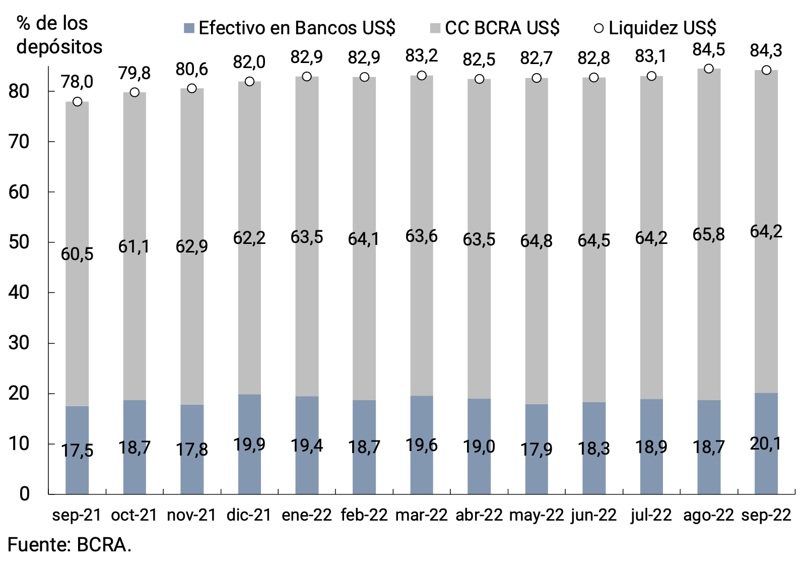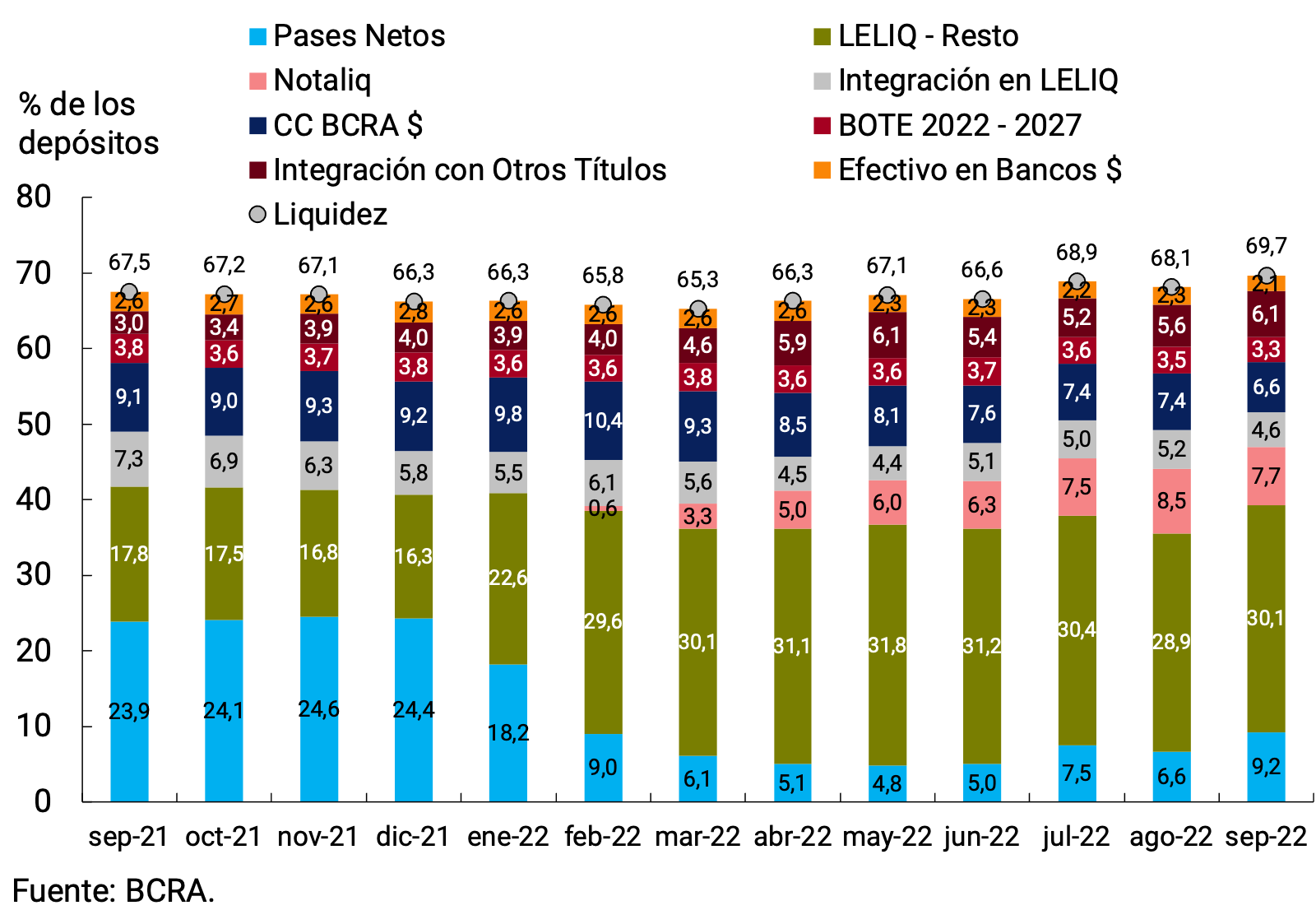6 Incluye las cuentas corrientes en el BCRA, el efectivo en bancos, los saldos de pases netos concertados con el BCRA, las tenencias de LELIQ y NOTALIQ y los bonos públicos elegibles para integrar encajes.