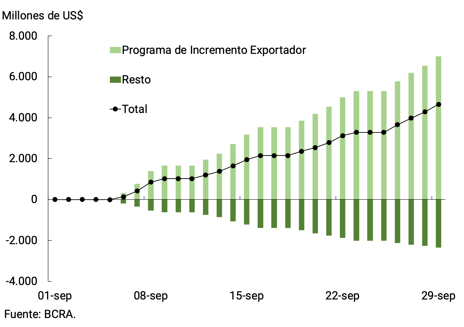 El 5 de septiembre entró en vigencia el “Programa de Incremento Exportador”, que permitió liquidar al complejo sojero divisas a un valor excepcional y transitorio de $200/US$. El BCRA adquirió por este mecanismo US$7.646 millones y, junto con el resto de las operaciones cambiarias del sector privado, dejó un saldo neto de US$5.000 millones en el mes. Estas operaciones implicaron una expansión de la liquidez y, en términos de base monetaria, se esterilizaron con pasivos remunerados.