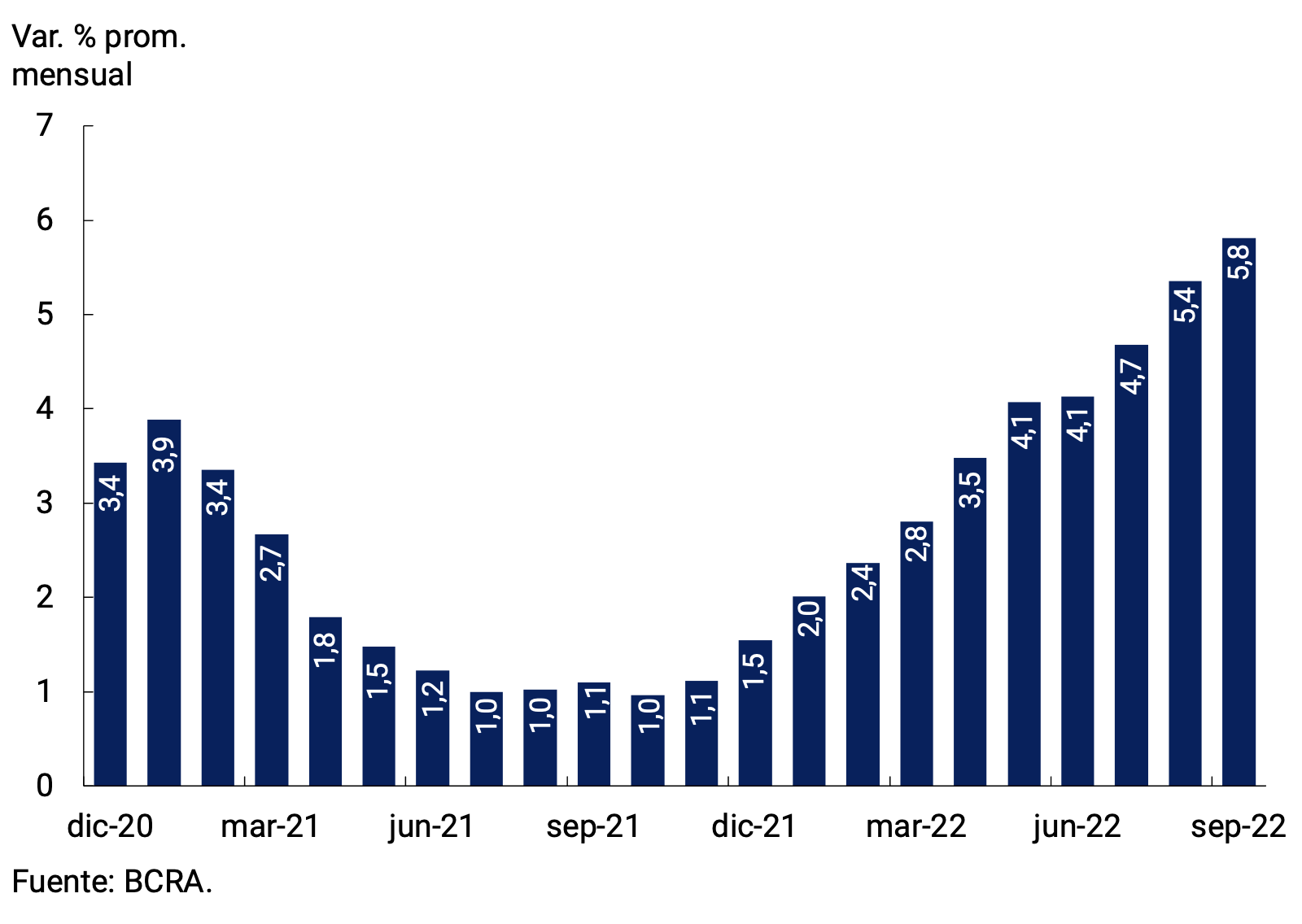 El BCRA volvió a incrementar sus tasas de interés de referencia en septiembre, con el fin de propender hacia retornos reales positivos sobre las inversiones en moneda local y preservar la estabilidad monetaria, cambiaria y financiera. Así, se elevó la tasa de interés de la LELIQ a 28 días de plazo en 5,5 p.p., que pasó a situarse en 75% n.a. (107,35% e.a.). Por su parte, la tasa de interés de las LELIQ a 180 días de plazo aumentó 7,5 p.p. hasta 83,5% n.a. (101,23% e.a.). En cuanto a los instrumentos de menor plazo, la tasa de interés de los pases pasivos a 1 día se incrementó 5,5 p.p. hasta 70% n.a. (101,24% e.a.); mientras que, la tasa de interés de pases activos a 1 día se elevó 7 p.p. y, de este modo, se situó en 95% n.a. (158,25% e.a.). Finalmente, el spread fijo de las NOTALIQ en la última licitación del mes se fijó en 8,5 p.p.