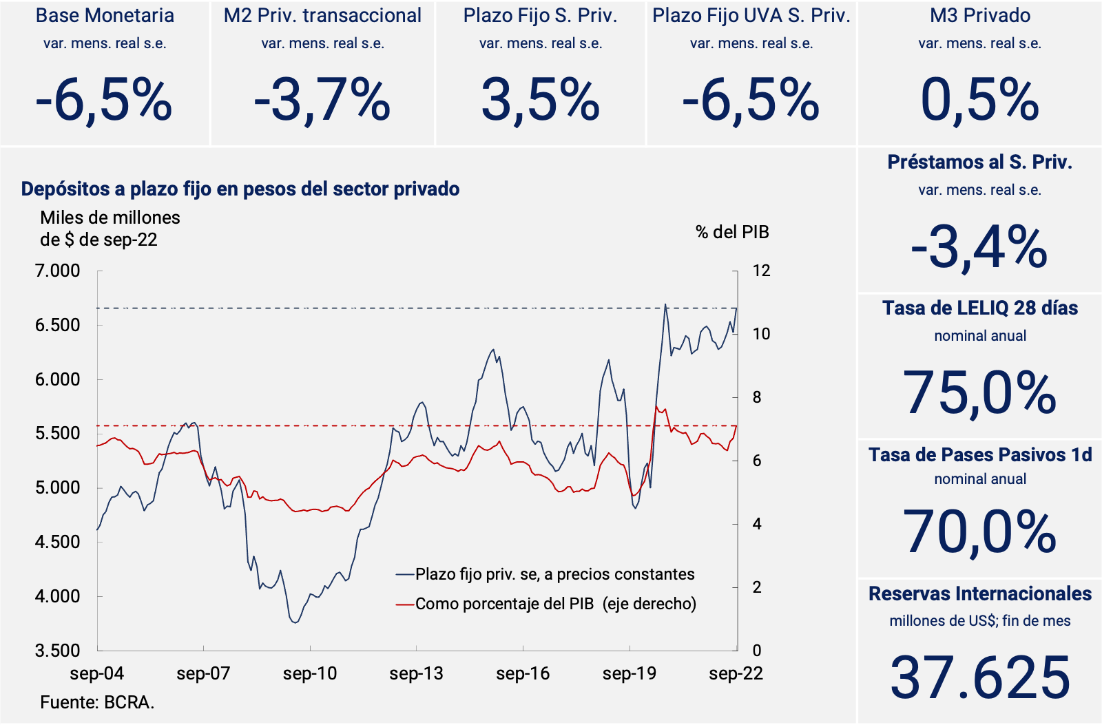 El bajo dinamismo de los medios de pago transaccionales contrastó con el crecimiento de los instrumentos de ahorro en pesos. Los depósitos a la vista remunerados registraron una expansión de 9,9% a precios constantes y sin estacionalidad, dinámica explicada casi plenamente por las tenencias de las Prestadoras de Servicios Financieros (PSF). Por otro lado, los depósitos a plazo fijo en pesos del sector privado a precios constantes habrían registrado una expansión mensual de 3,5% s.e. en septiembre, revirtiendo la caída del mes previo. De este modo, las colocaciones a precios constantes se mantuvieron en torno a los niveles máximos de las últimas décadas. Como porcentaje del PIB dichos depósitos se habrían ubicado en 7,1% en septiembre (0,4 p.p. más que en agosto), guarismo que también se ubica entre los máximos de los últimos años.