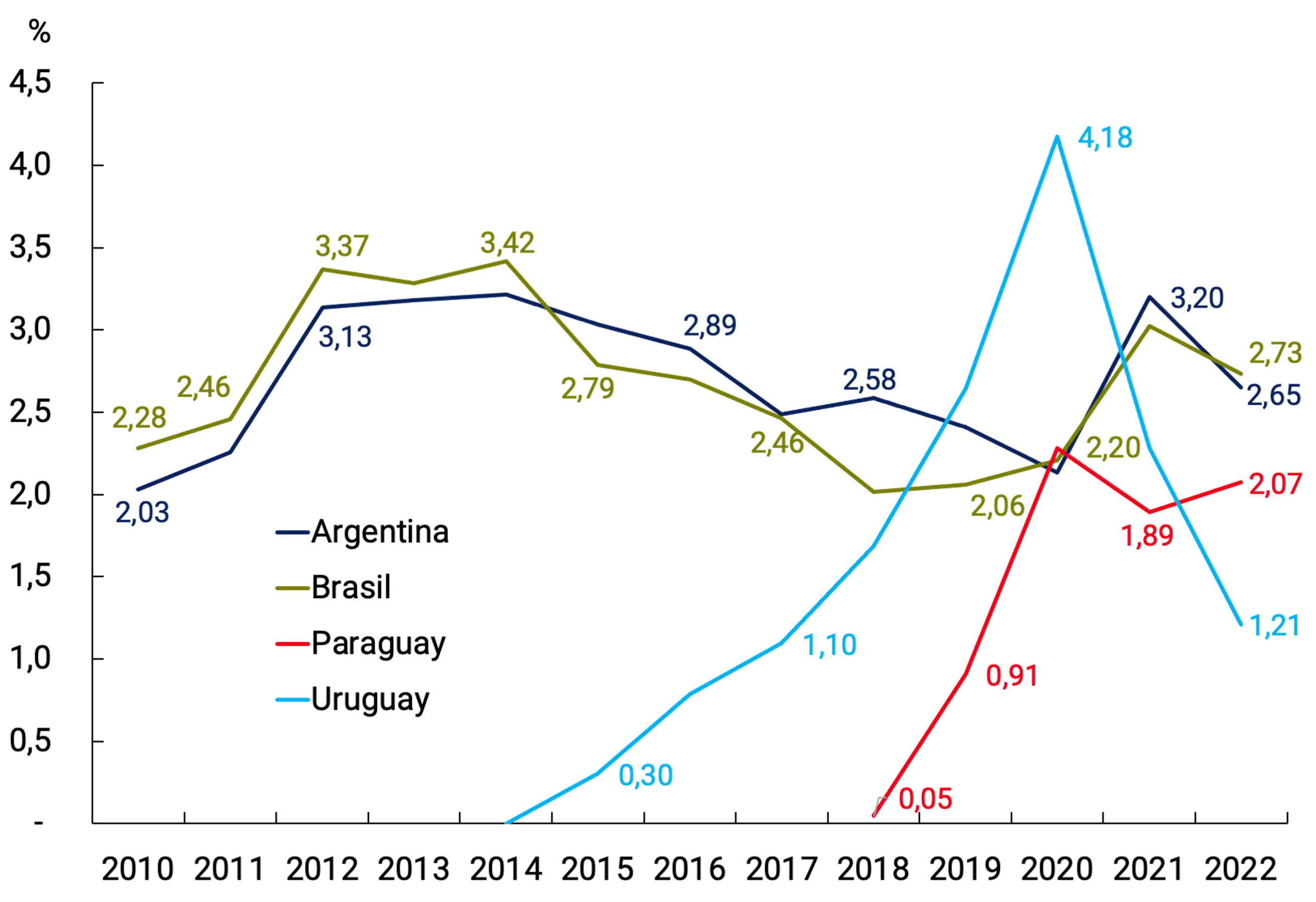 7 LAC8 corresponde a las ocho principales economías de América Latina como son Argentina, Brasil, Chile, Colombia, México, Perú, Venezuela y Uruguay. Desde 2018 a 2022 información no disponible para Venezuela. Año 2022 incluye datos de cuentas nacionales proyectados en base a estadísticas nacionales.