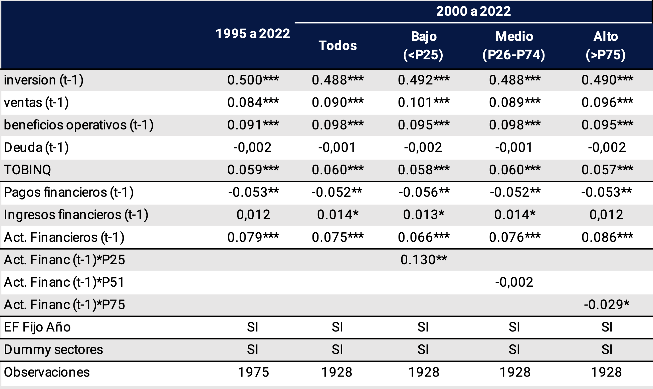 11 La elasticidad total del ratio activo financiero a inversión para empresas pertenecientes a percentiles bajos de la distribución del activo es de 0,196 (suma de 0,066 del efecto promedio más 0,130 del efecto especifico del percentil 25), en tanto que la elasticidad total para empresas de percentiles altos en la distribución del activo es de 0,057 (suma de 0,086 del efecto promedio menos 0,029 del efecto especifico del percentil 75).