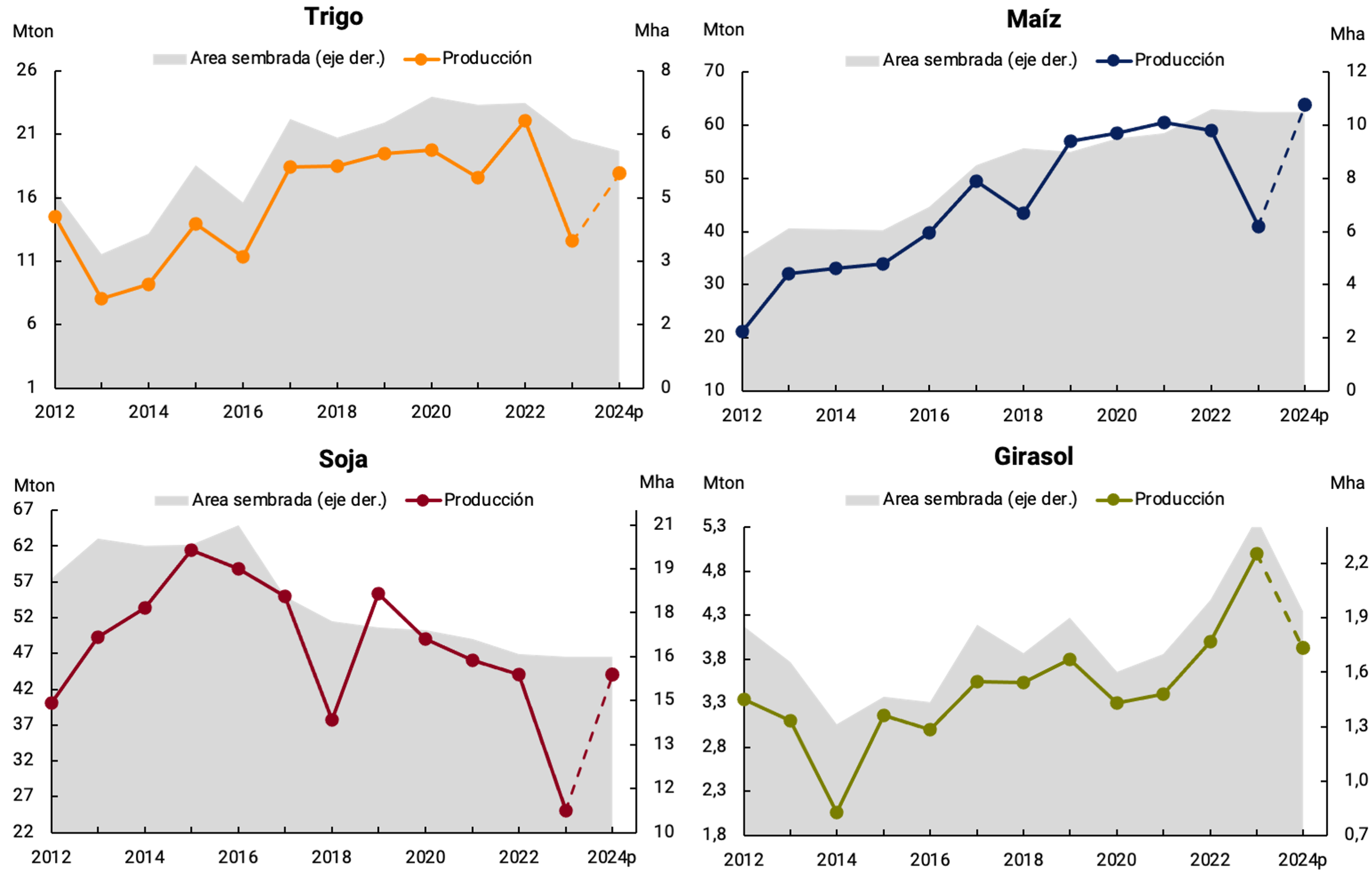 En lo que resta del año el producto agrícola reflejará la evolución de las tareas que se realicen con vistas a la próxima campaña13 y el resultado de las cosechas de algunos cultivos, principalmente de trigo. La consolidación del fenómeno climático El Niño con evidentes mejoras en los perfiles de agua de los suelos en la zona núcleo del país, asegurarían la reversión de las condiciones climáticas que prevalecieron en las últimas tres campañas. Ello permite prever una sustancial mejora en la producción agrícola correspondiente a la campaña 2023/2024 (ver Apartado 3 / Pronósticos de recuperación para la próxima campaña agrícola).